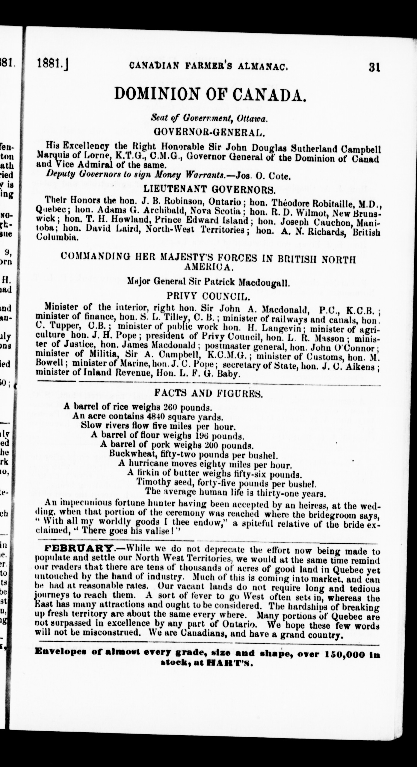 Hart's Canadian almanac and repository of useful information and division court directory for the counties of Lanark and Renfrew for the year of our Lord 1881 : 25th (1881)