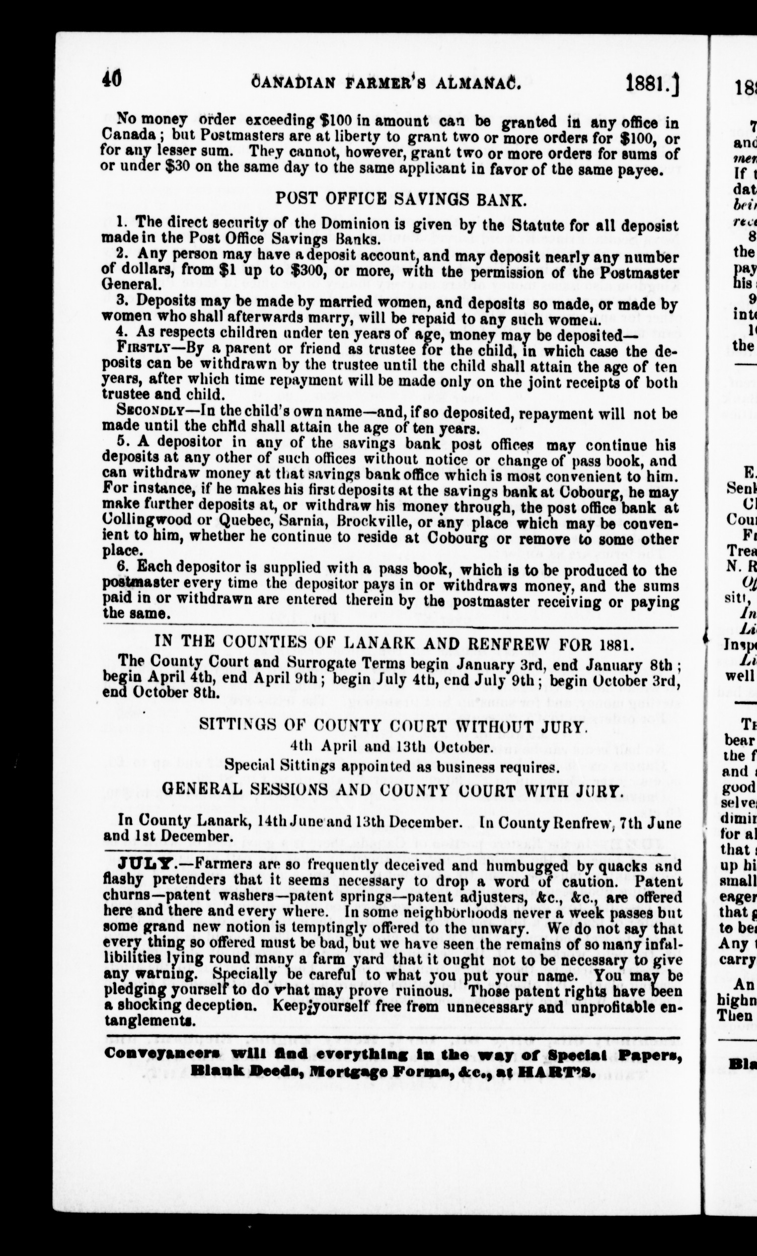 Hart's Canadian almanac and repository of useful information and division court directory for the counties of Lanark and Renfrew for the year of our Lord 1881 : 25th (1881)