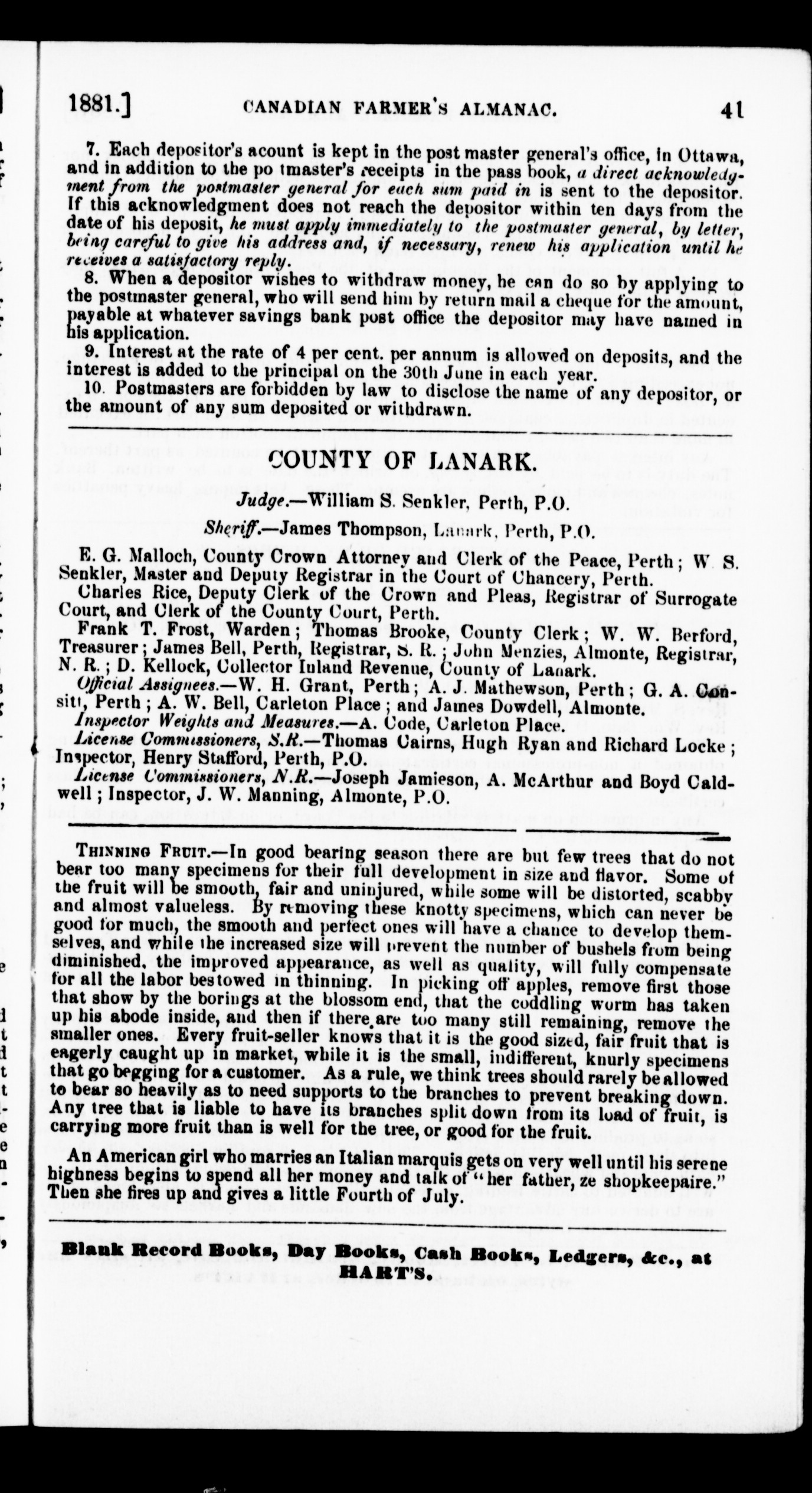 - Hart's Canadian almanac and repository of useful information and division court directory for the counties of Lanark and Renfrew for the year of our Lord 1881 : 25th (1881)