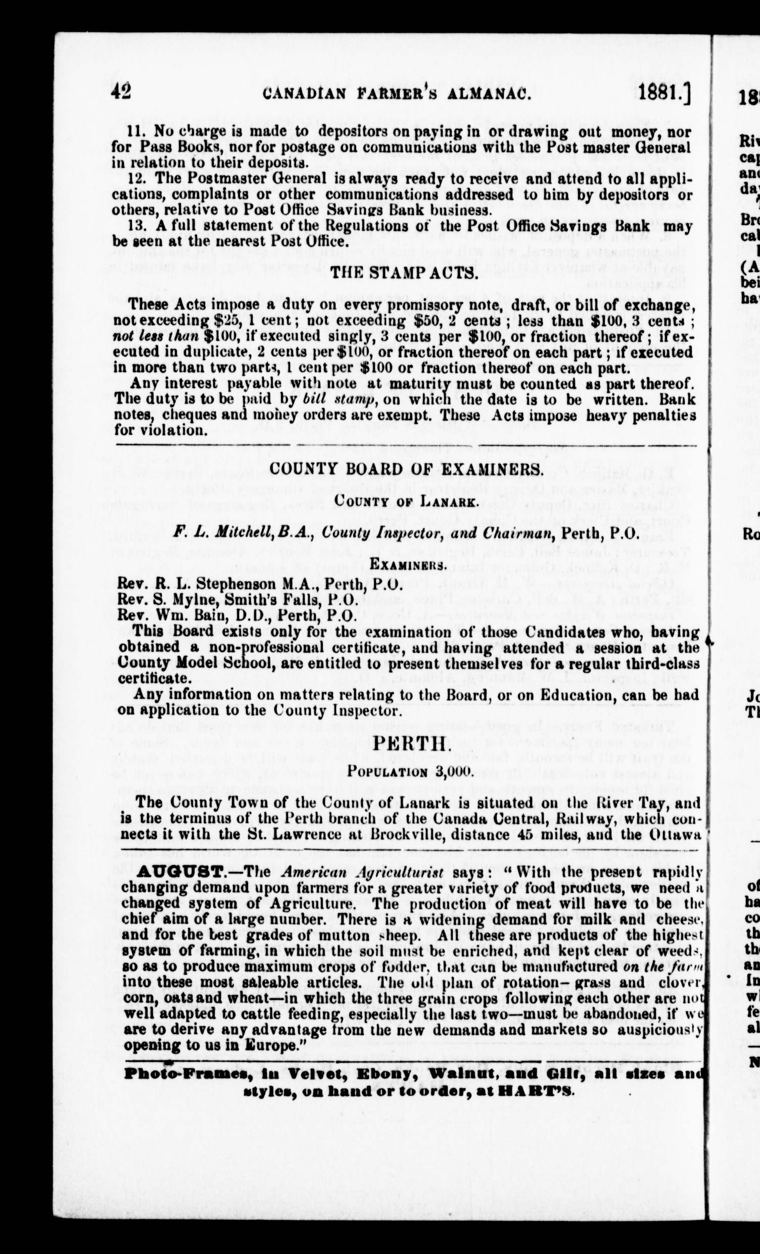 Hart's Canadian almanac and repository of useful information for the United Counties of Lanark and Renfrew for the year ... : Hart's Canadian almanac and repository of useful information and division court directory for the counties of Lanark and Renfrew for the year of our Lord 1881 : 25th (1881)