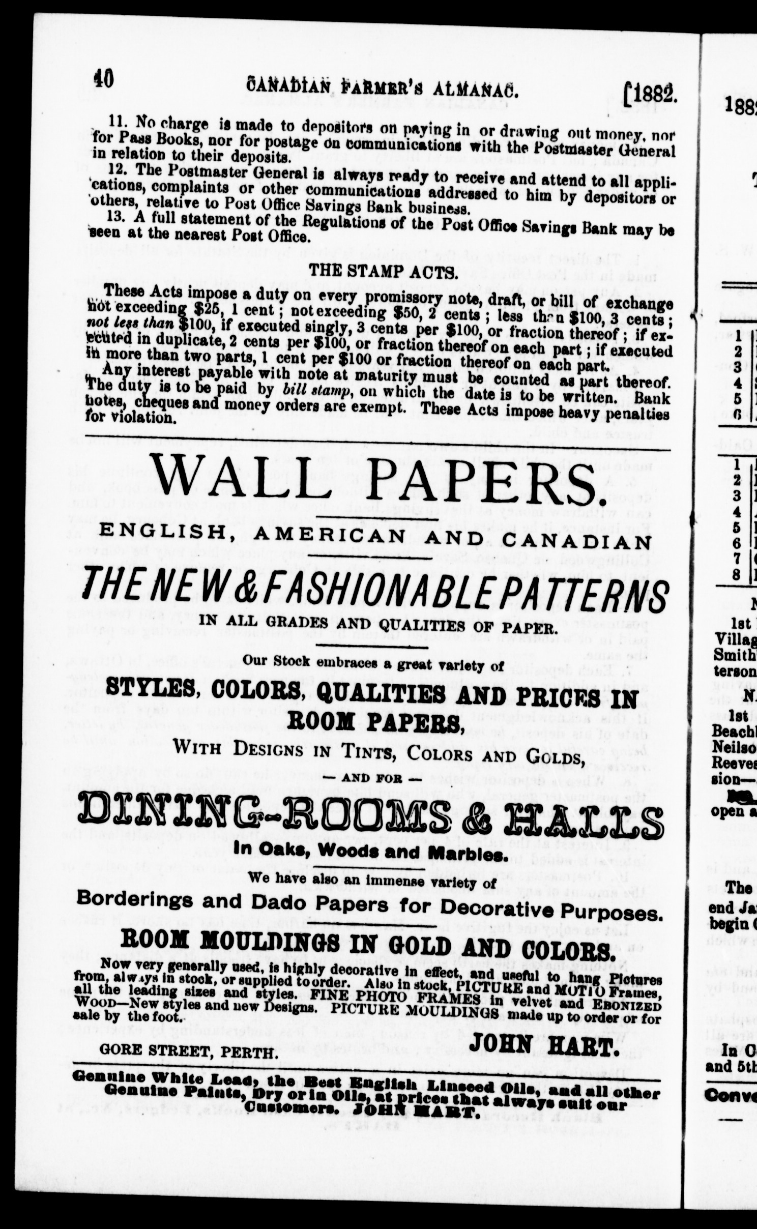 Hart's Canadian almanac and repository of useful information for the United Counties of Lanark and Renfrew for the year ... : Hart's Canadian almanac and repository of useful information and division court directory for the counties of Lanark and Renfrew for the year of our Lord 1882 : 26th (1882)