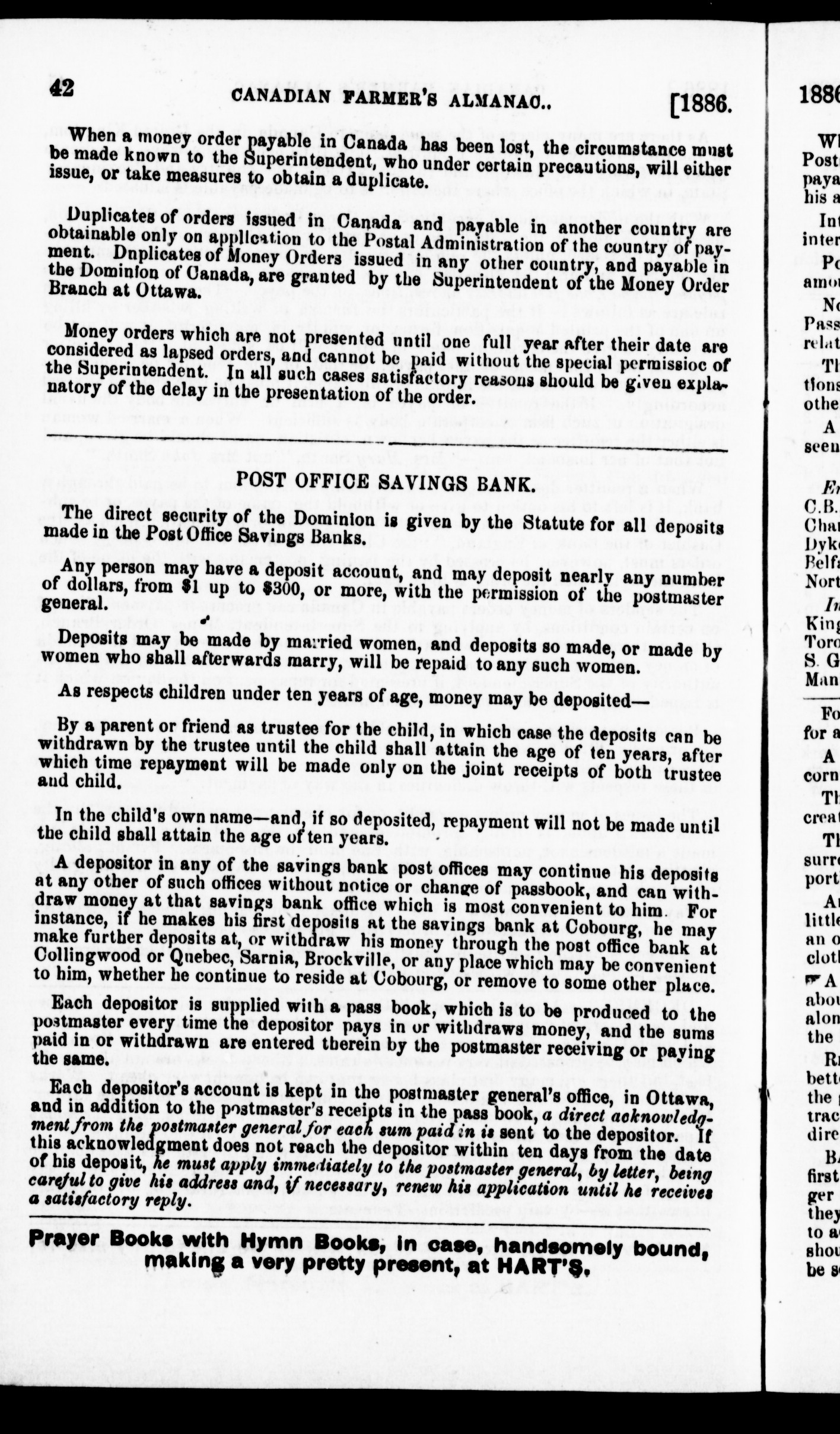 - Hart's Canadian almanac and repository of useful information and division court directory for the counties of Lanark and Renfrew for the year of our Lord 1886 : 30th (1886)