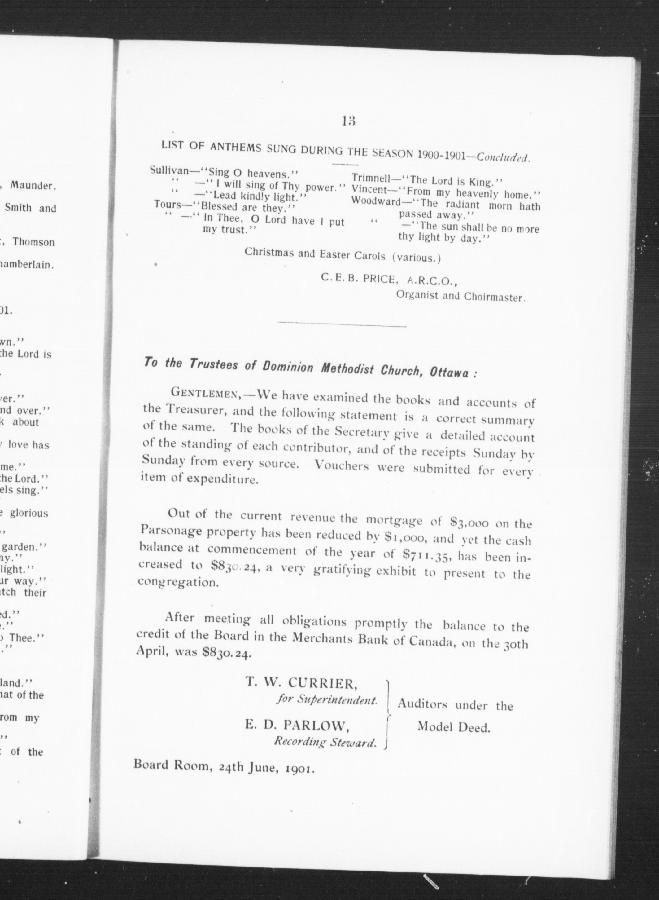 Annual report for the year ending 30th April ... / Dominion Methodist Church, Ottawa : Annual report for year ending 30th April 1901 / Dominion Methodist Church, Ottawa : 1900/1901