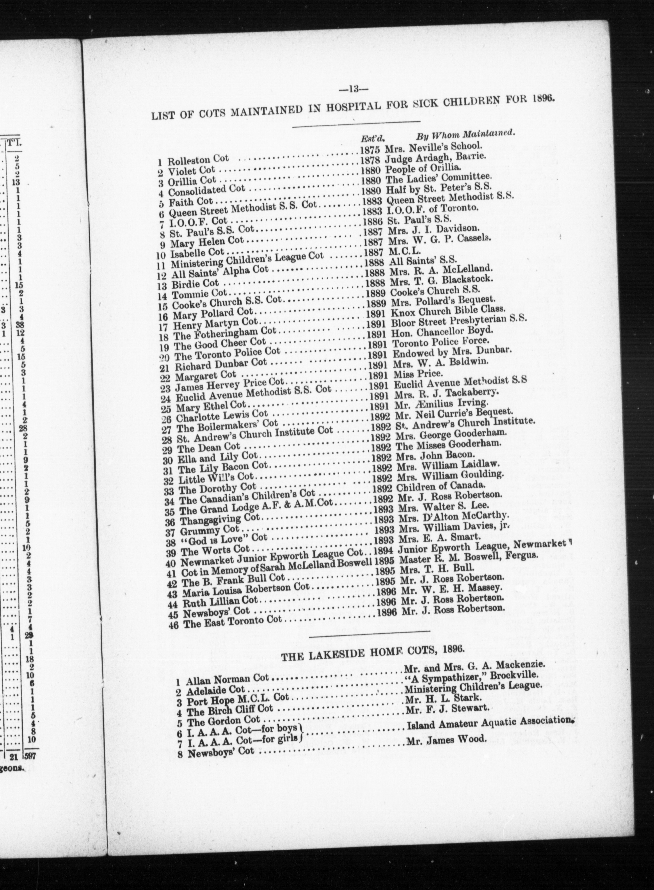- Twenty-first annual report of the Hospital for Sick Children, College Street, Toronto, and the Lakeside Home for Little Children ... for the year ending Sept. 30, 1896 : Twenty-first (1895/96)