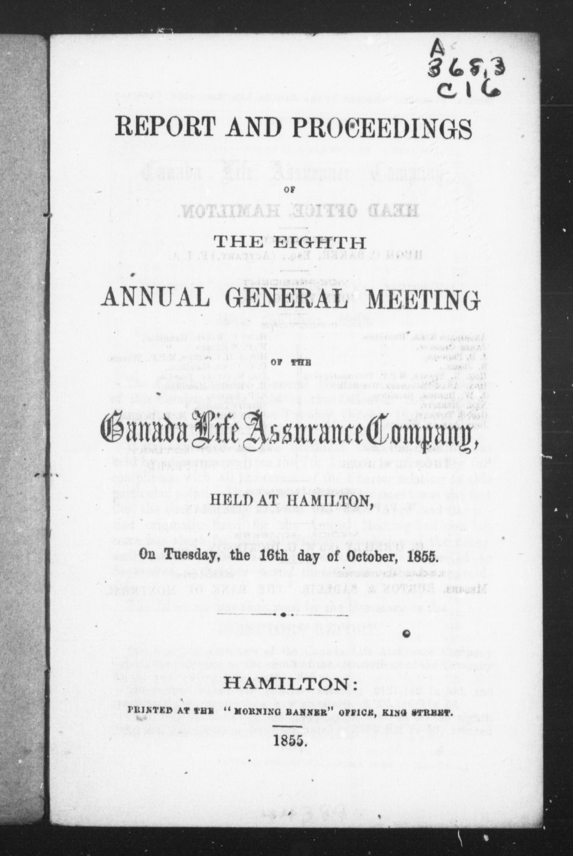 - Report and proceedings of the eighth annual general meeting of the Canada Life Assurance Company : Eighth (1854/1855)