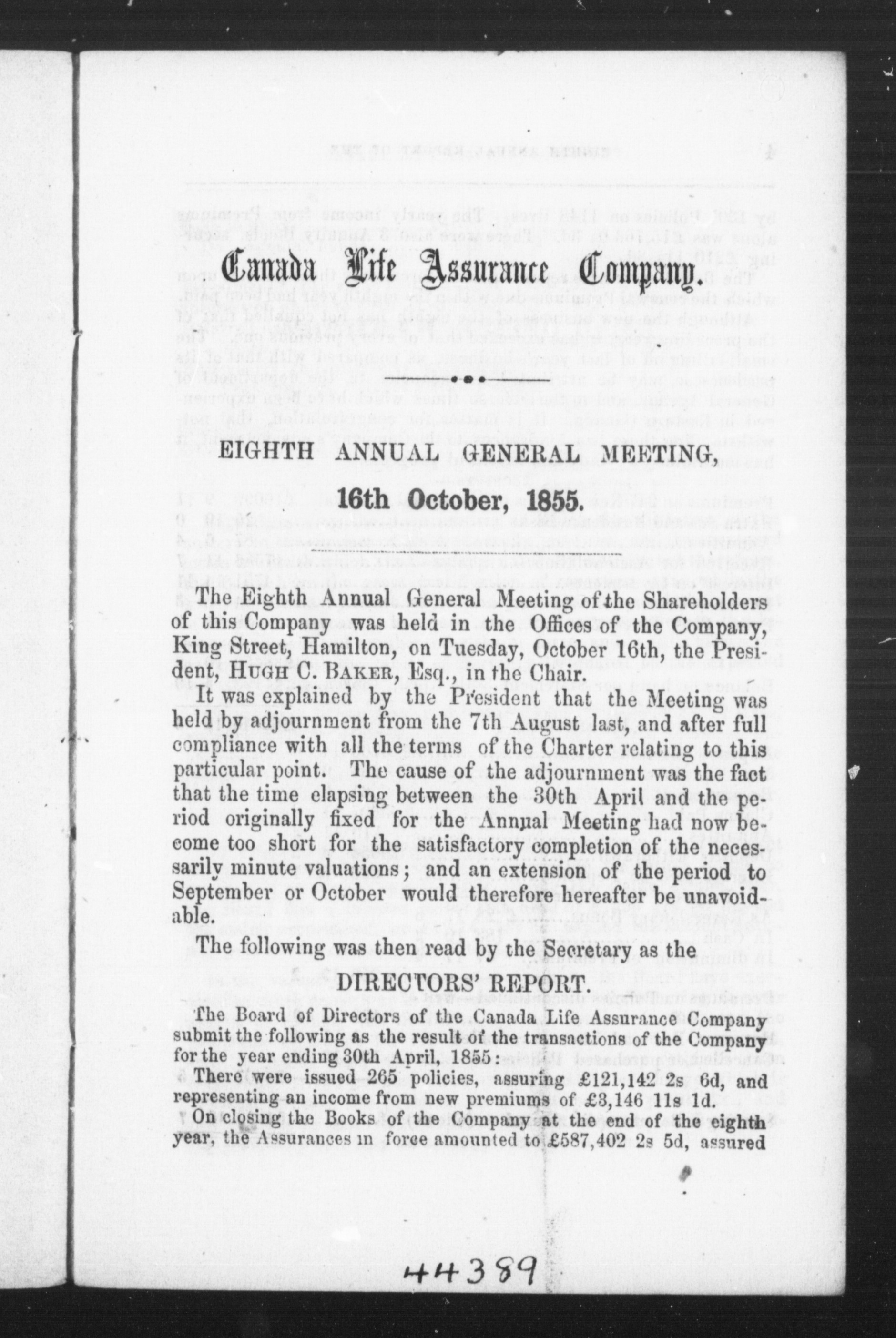 Report and proceedings of the ... annual general meeting of the Canada Life Assurance Company. : Report and proceedings of the eighth annual general meeting of the Canada Life Assurance Company : Eighth (1854/1855)