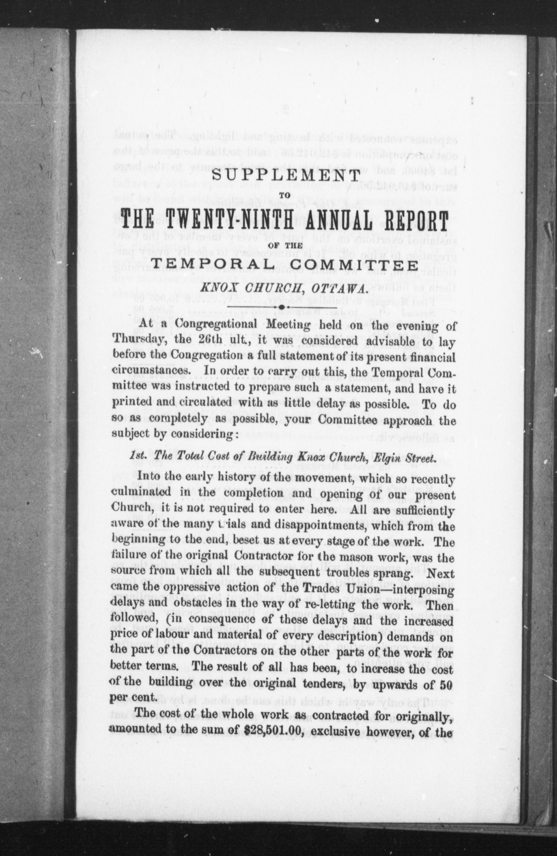 [Ottawa] : [Temporal Committee of Knox Church], [1874]