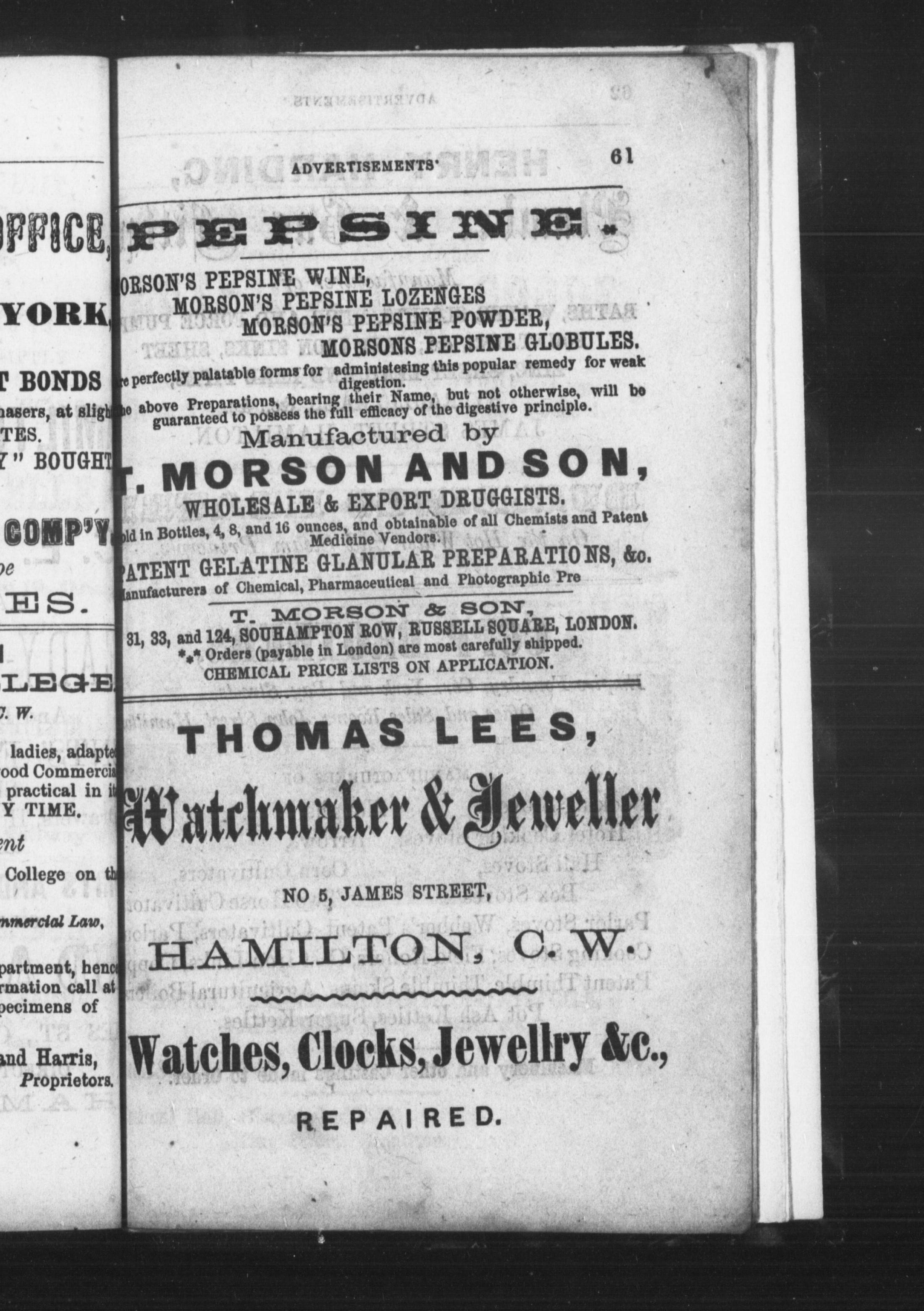 Hamilton, C.W. [Ont.] : T. & R. White, Printers & Publishers, [1866?]