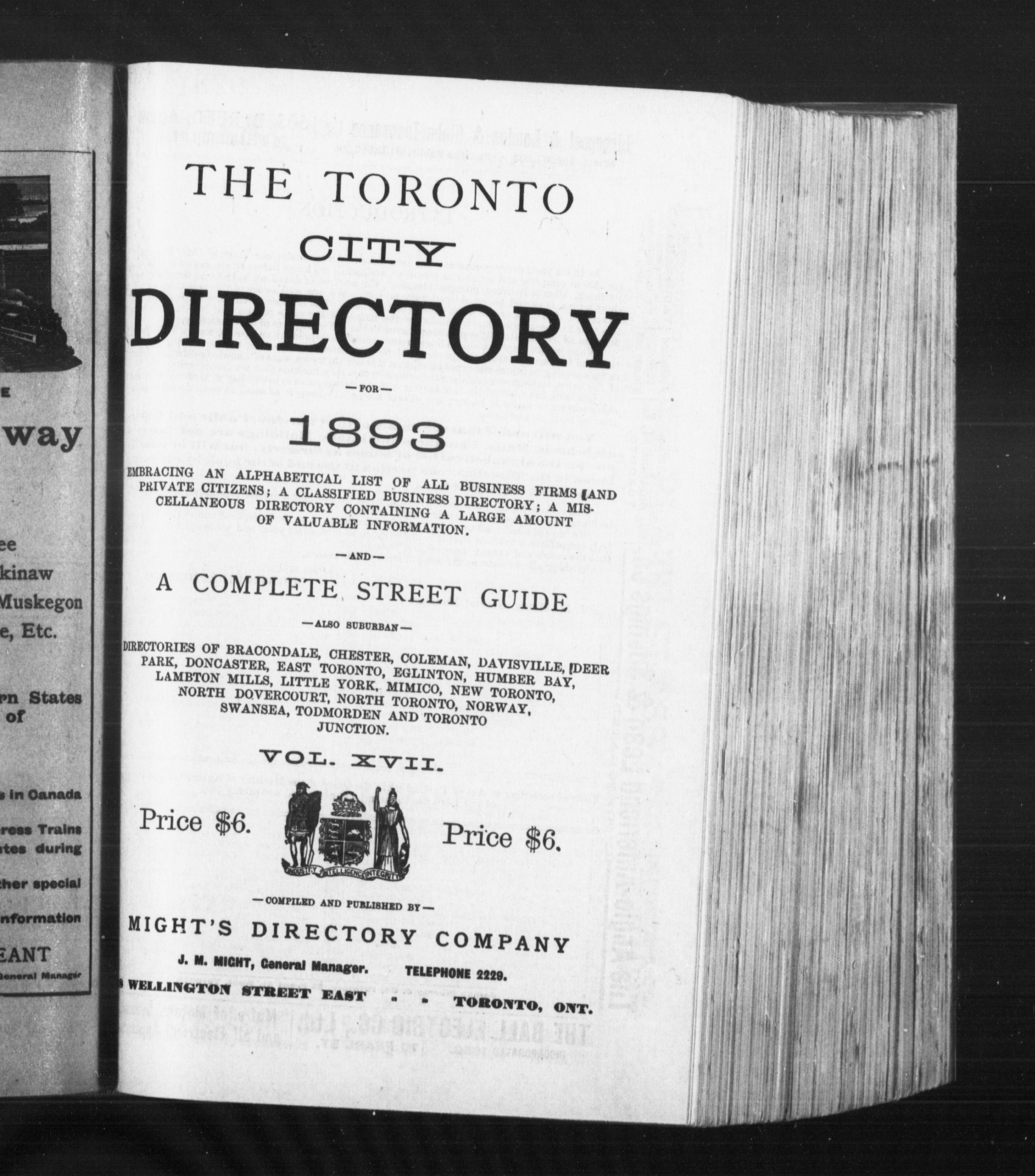 Toronto, Ont. : Might's Directory Company, [1893]; 1664 images avec recherche en texte intégral