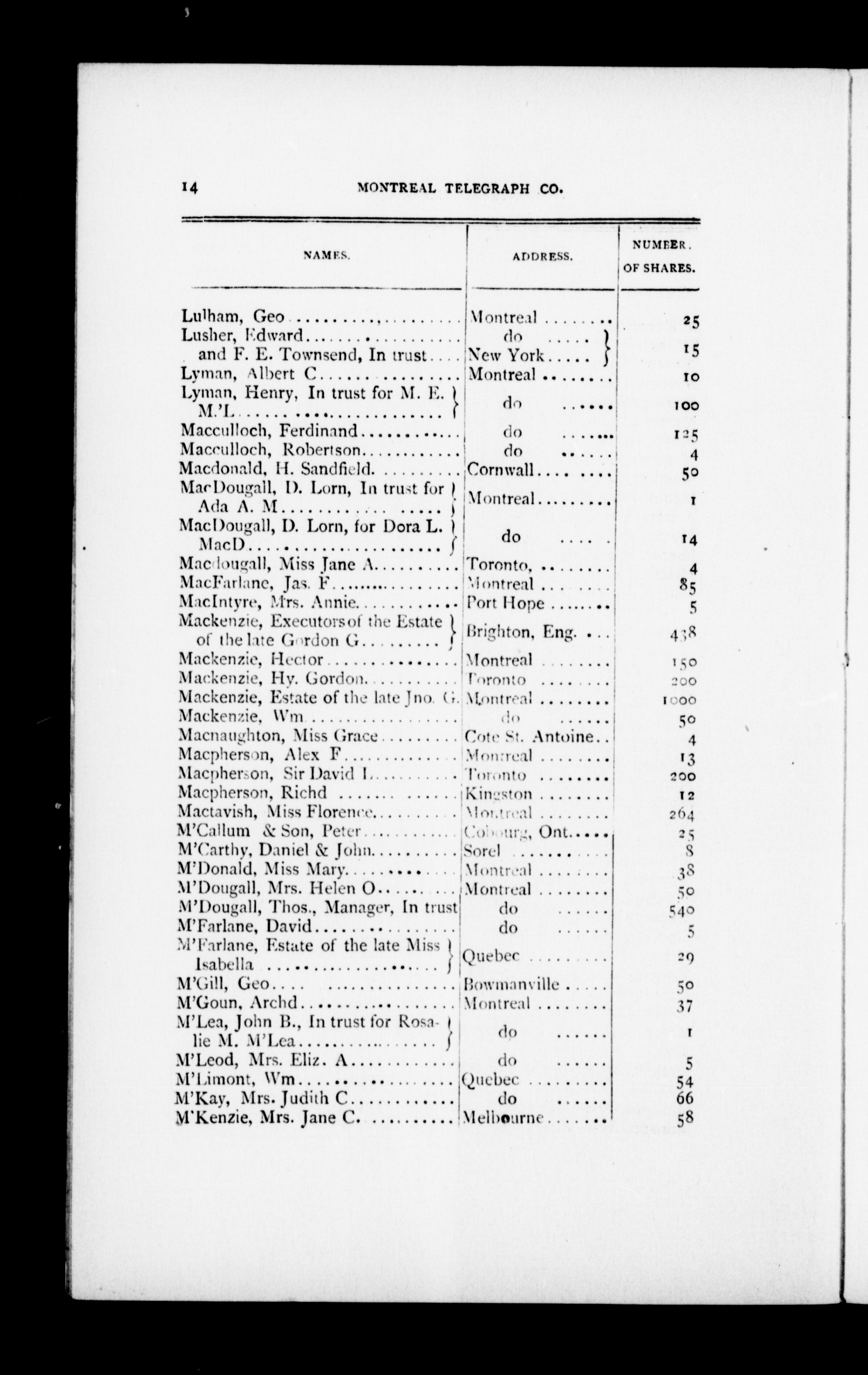 - Annual report, statements and list of shareholders of the Montreal Telegraph Company : 1885