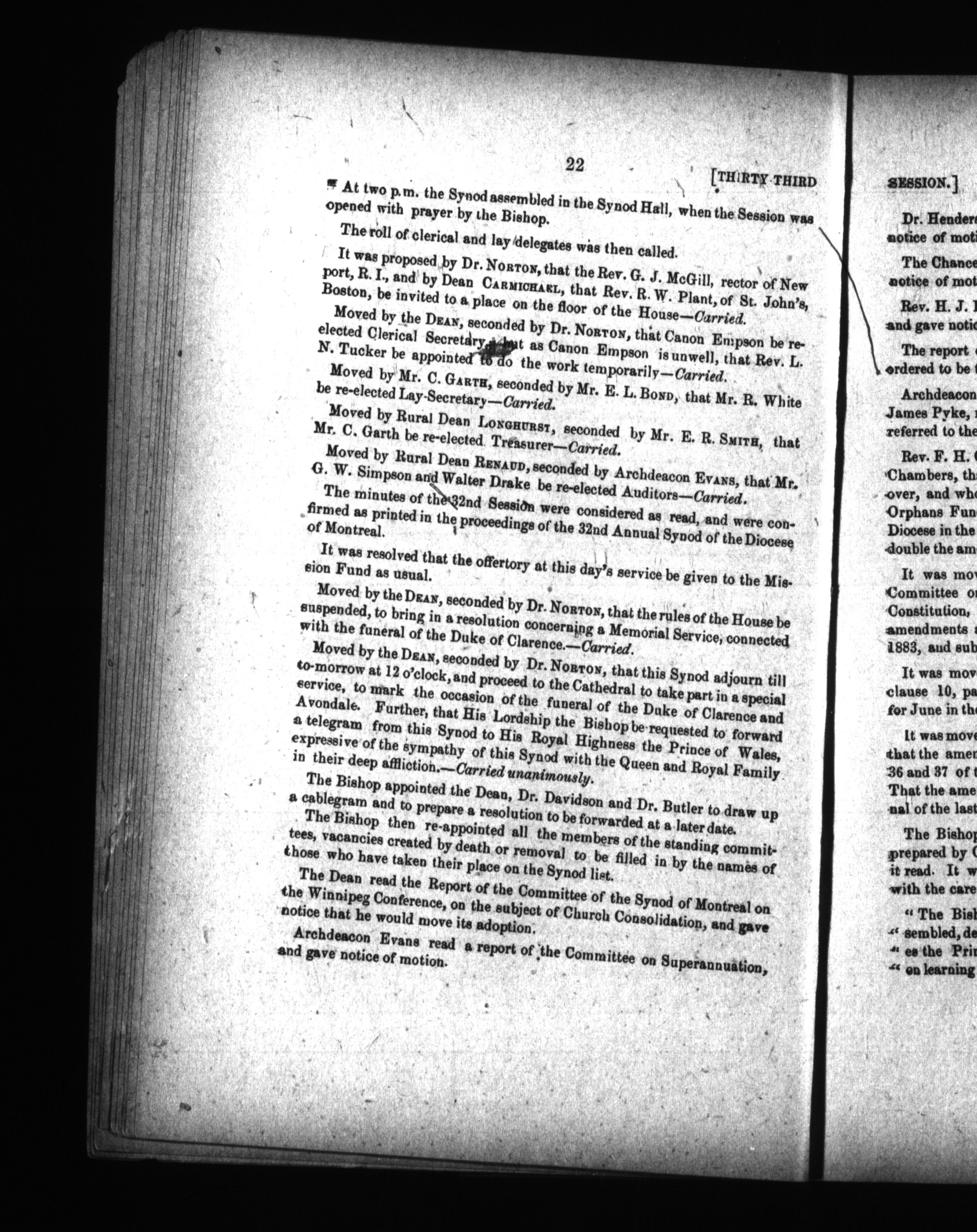 Proceedings of the ... annual Synod of the Diocese of Montreal, Canada : Proceedings of the thirty-third annual Synod of the Diocese of Montreal, Canada, held in the city of Montreal, on the 19th, 20th, and 21st days of January, in the year of our Lord MDCCCXCII : Thirty-Third (1892)