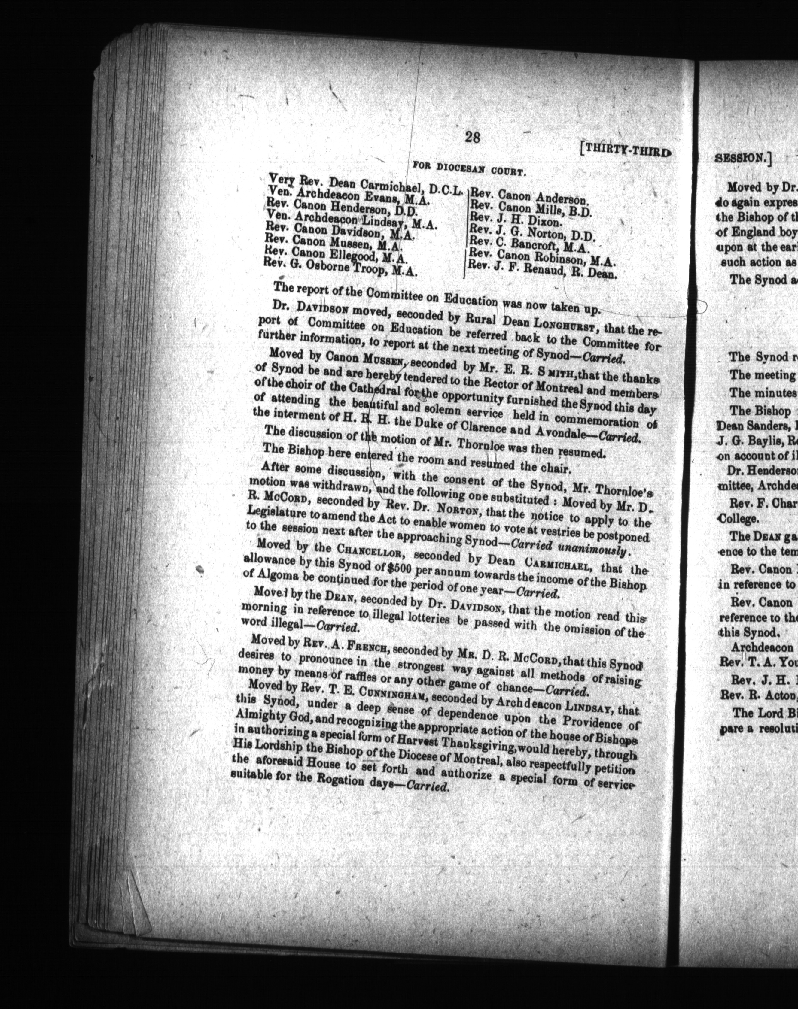 Proceedings of the ... annual Synod of the Diocese of Montreal, Canada : Proceedings of the thirty-third annual Synod of the Diocese of Montreal, Canada, held in the city of Montreal, on the 19th, 20th, and 21st days of January, in the year of our Lord MDCCCXCII : Thirty-Third (1892)