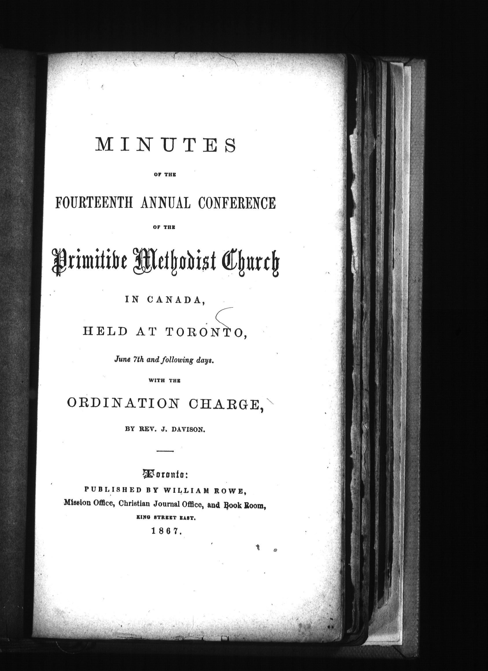 Minutes of the fourteenth annual conference of the Primitive Methodist Church in Canada, held at Toronto, June 7th and following days : Fourteenth (1867)