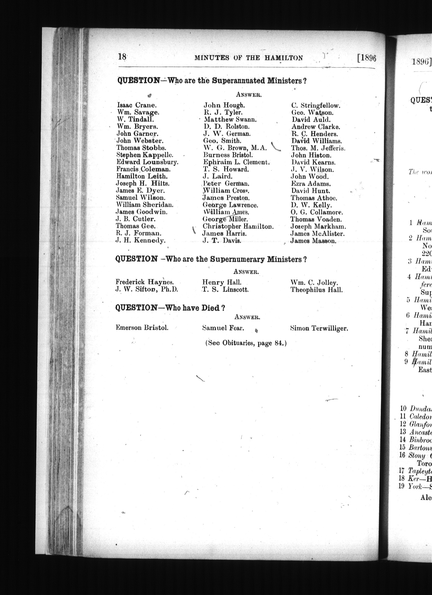 - Minutes of the proceedings of the second session of the Hamilton Annual Conference of the Methodist Church, held in the Methodist Church, in the town of Galt, Ont., from Wednesday, june 3rd, to Tuesday evening, June 9th, 1896 : Second (1896)