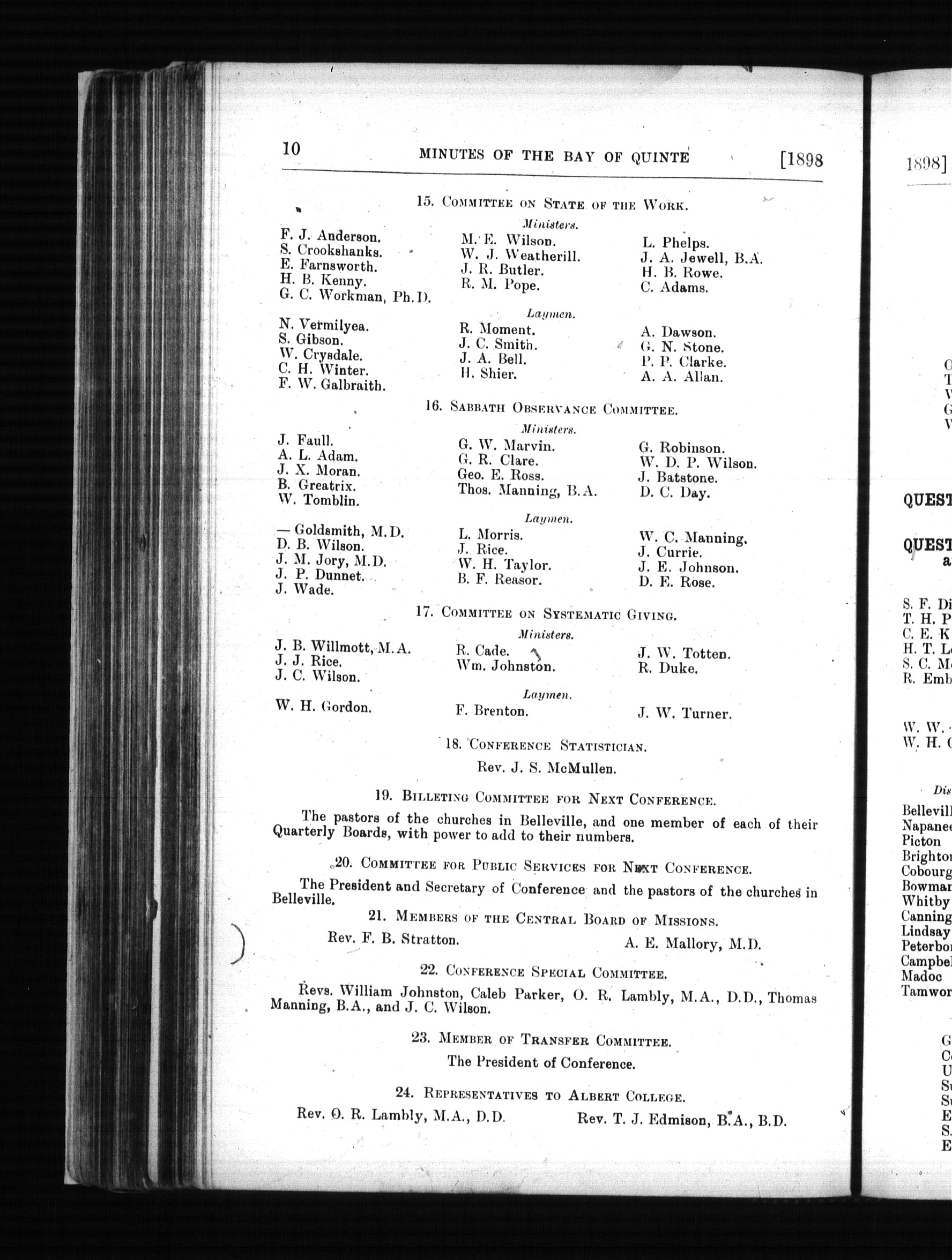 Minutes of the proceedings of the ... session of the Bay of Quinte Conference of the Methodist Church : Minutes of the proceedings of the fifteenth session of the Bay of Quinte Annual Conference of the Methodist Church, held in the Cambridge Street Methodist Church, Lindsay, from June 2nd to June 8th, 1898 : Fifteenth (1898)