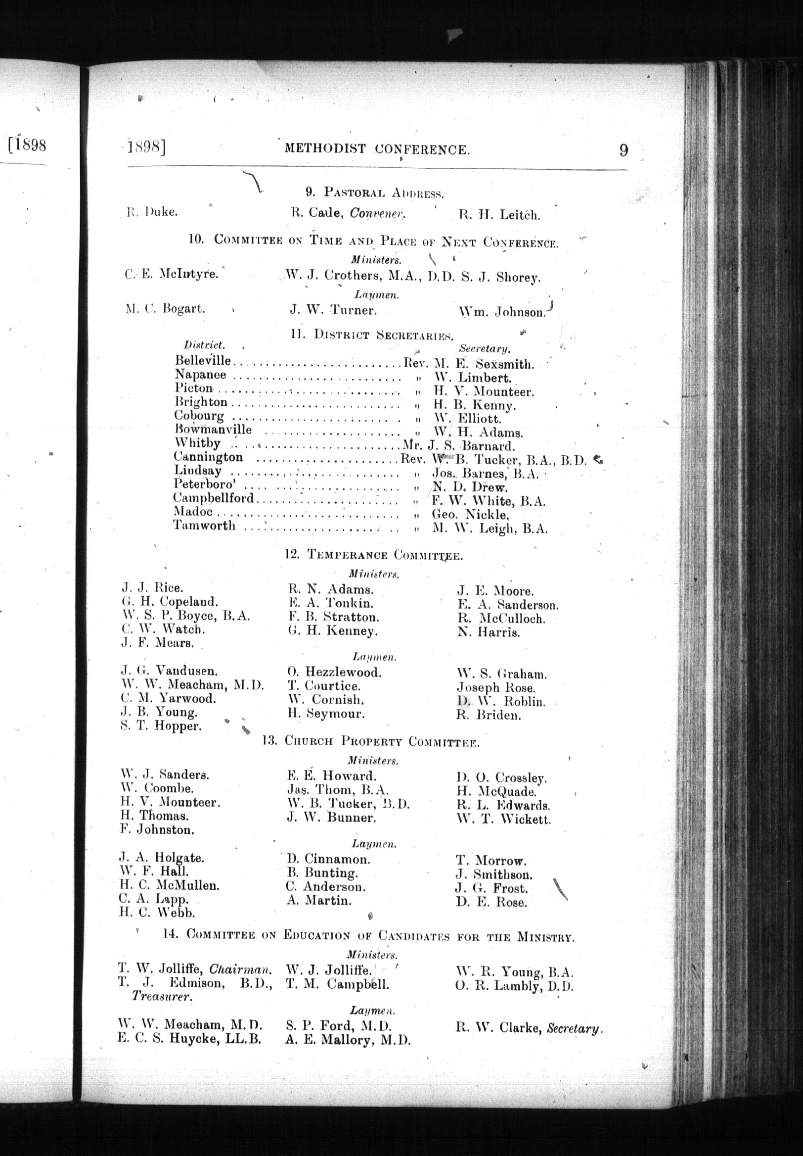 Minutes of the proceedings of the ... session of the Bay of Quinte Conference of the Methodist Church : Minutes of the proceedings of the fifteenth session of the Bay of Quinte Annual Conference of the Methodist Church, held in the Cambridge Street Methodist Church, Lindsay, from June 2nd to June 8th, 1898 : Fifteenth (1898)
