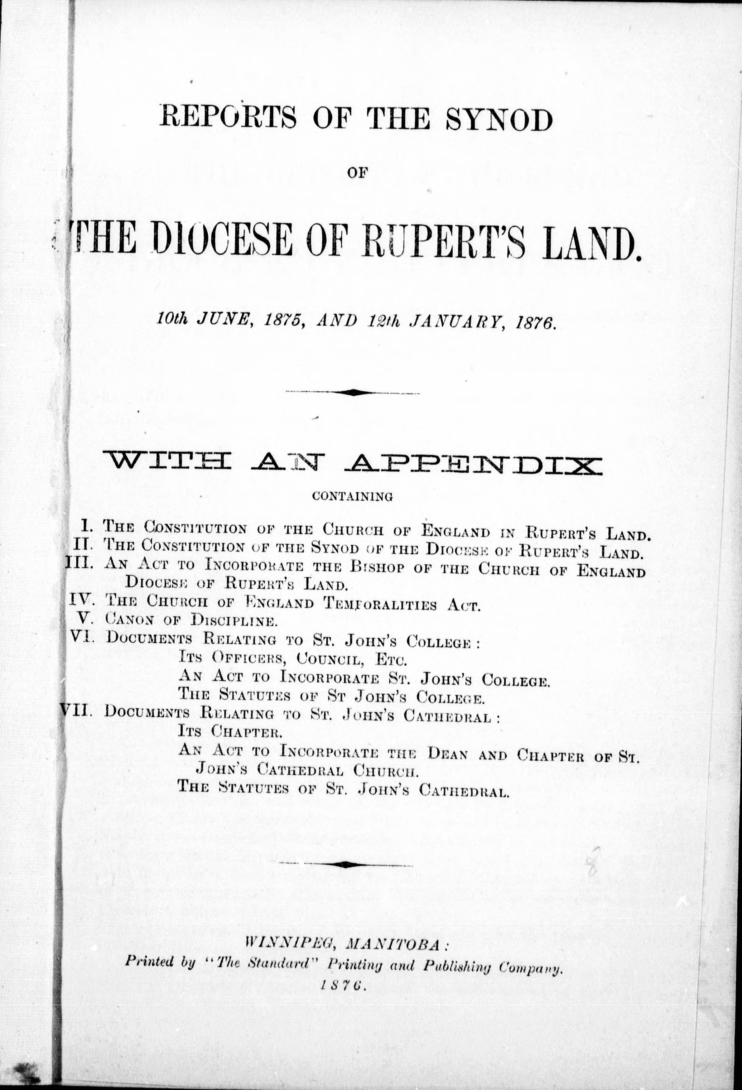 - [Winnipeg]: [Synod of the Diocese of Rupert's Land], [1876?]