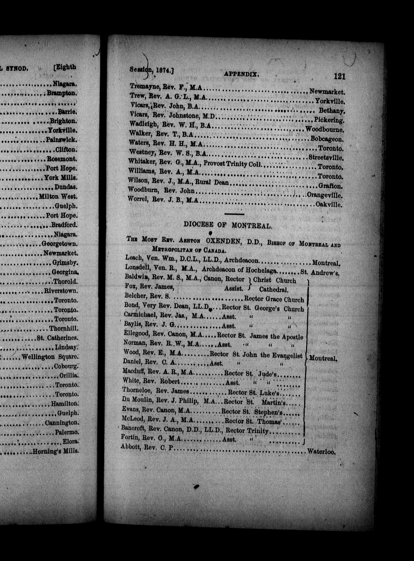 [Montréal?] : [Provincial Synod of the United Church of England and Ireland in Canada], 1874; 143 images avec recherche en texte intégral
