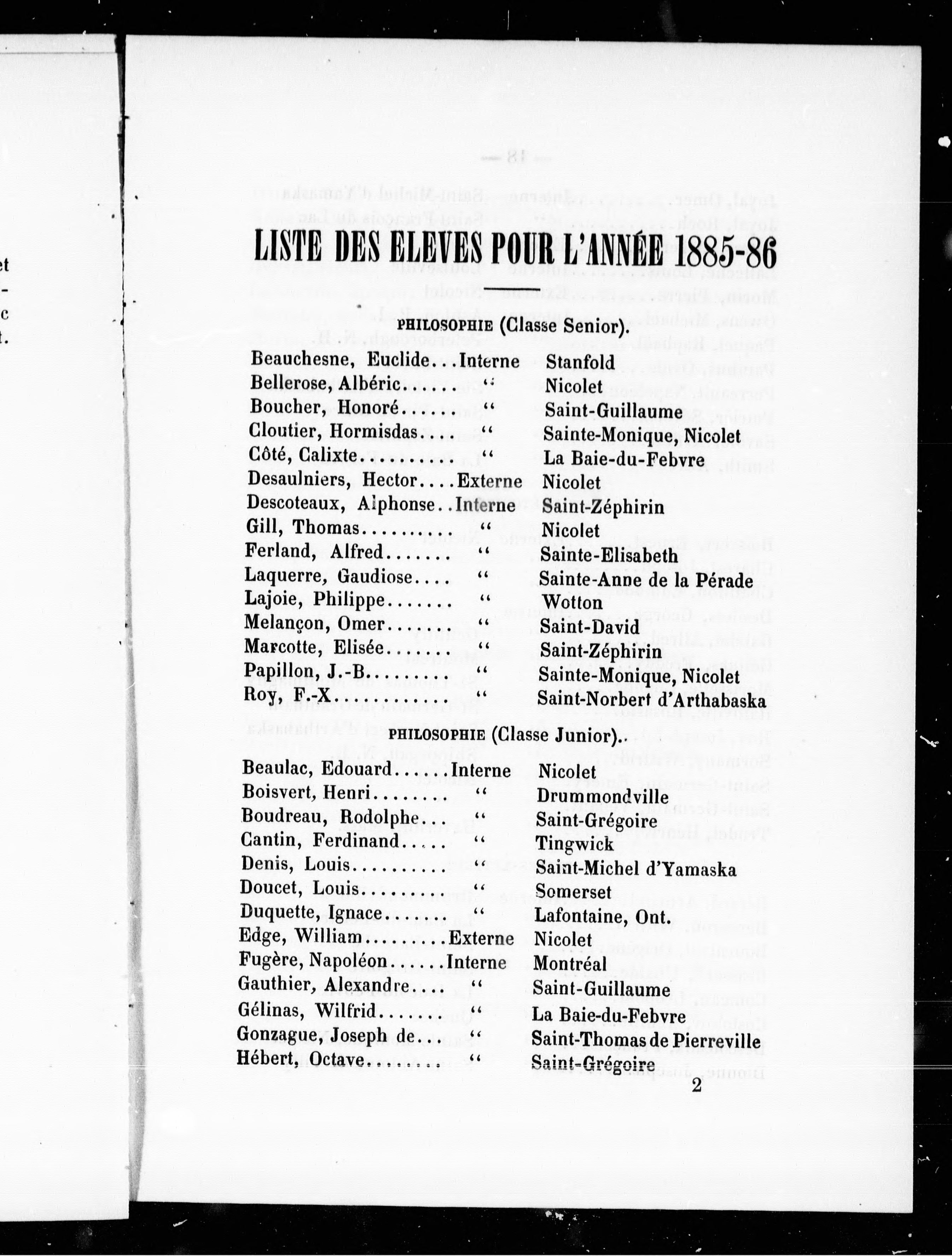 - Séminaire de Nicolet : année académique 1885-86 : 1885/86