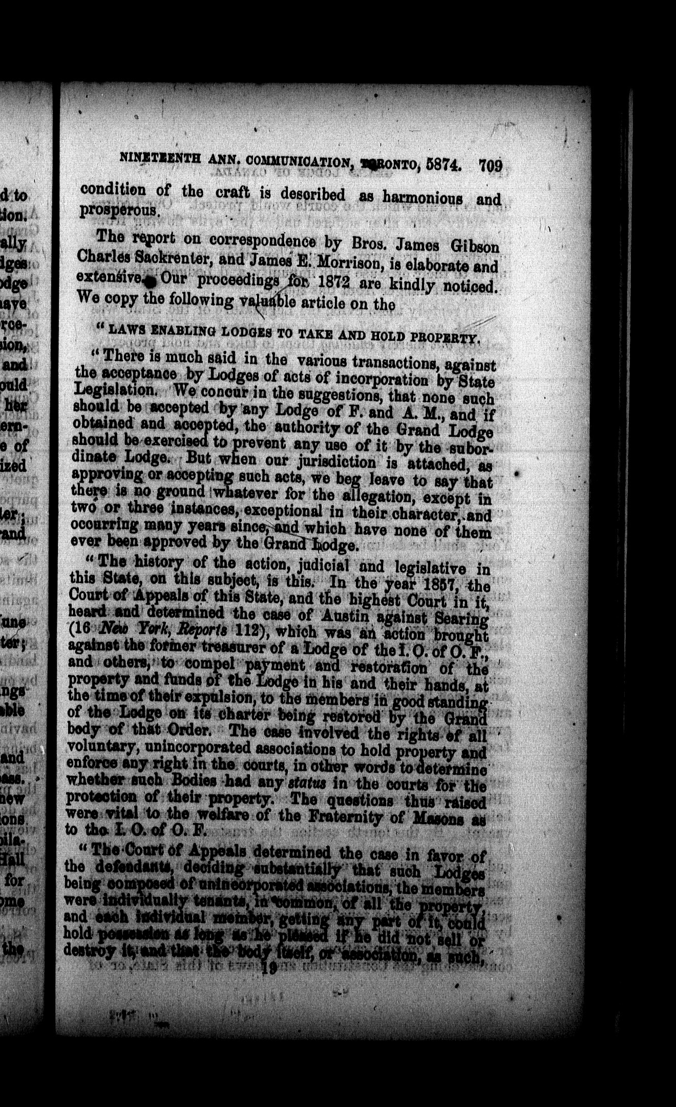 Proceedings of the Grand Lodge of Ancient Free and Accepted Masons of Canada ... : Proceedings of the Grand Lodge of Ancient Free and Accepted Masons of Canada, at a special communication, held at the village of Trenton, on the 24th day of Sept., A.D. 1873, A.L. 5873, also at its nineteenth annual communication, held at Toronto, Ont., on the 8th & 9th days of July, A.D. 1874, A.L. 5874 : Nineteenth (1874)