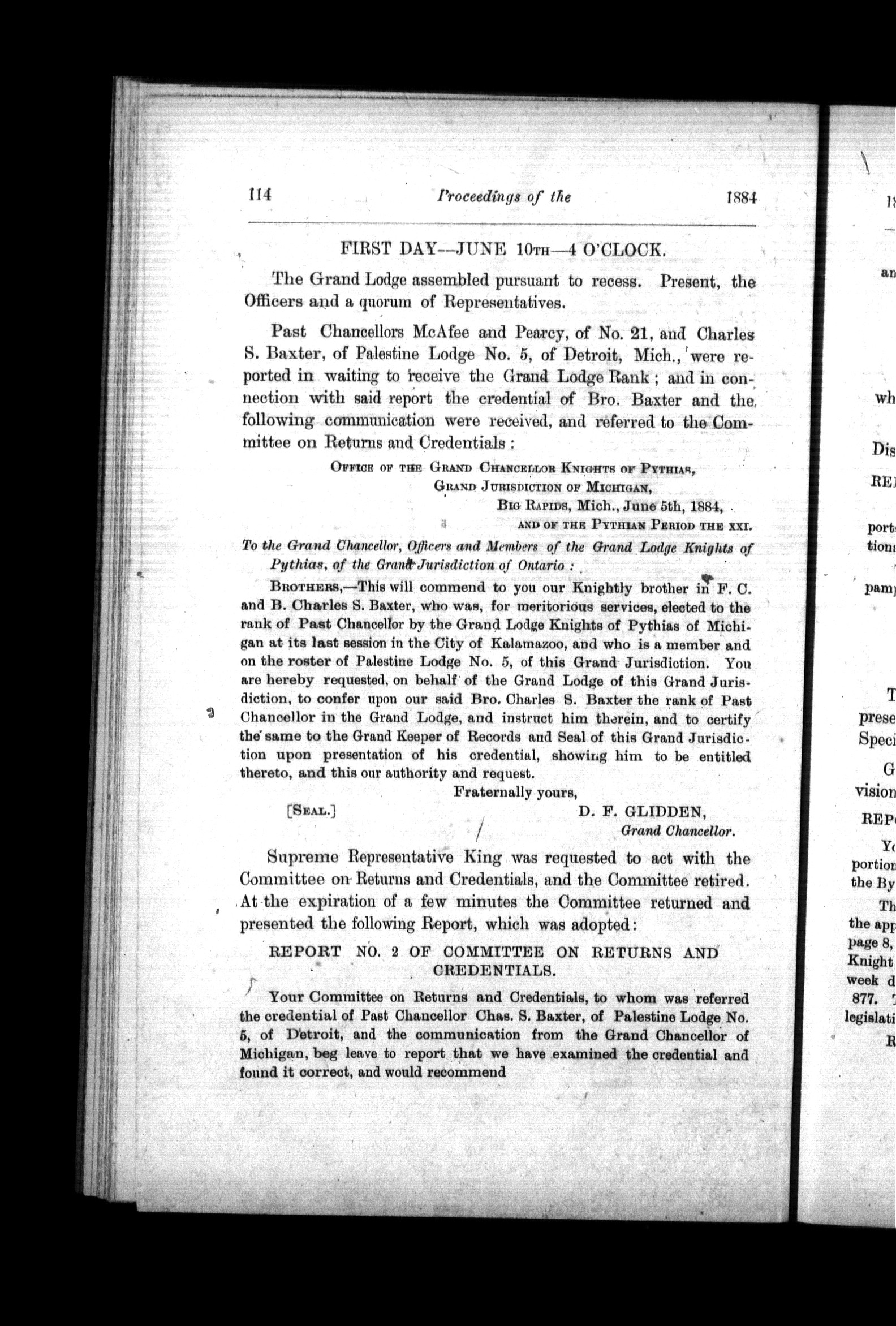 Proceedings of the Grand Lodge of Ontario : : Proceedings of the Grand Lodge of Ontario : thirteenth annual convention, held at Windsor, June 10th, 11th and 12th, 1884, Pythian Period XXI : Thirteenth (1884)