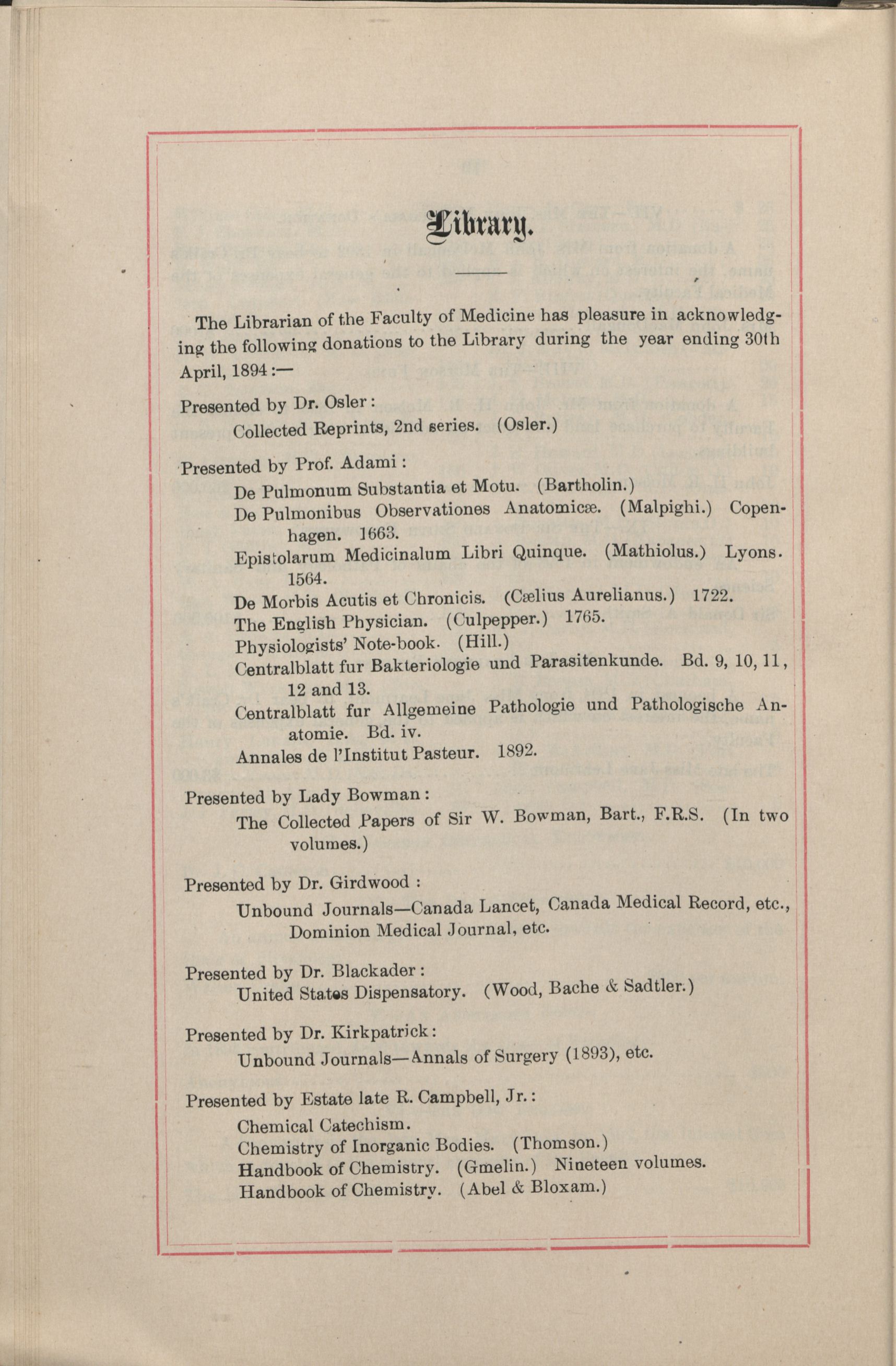 - Calendar of the Faculty of Medicine, McGill University : Sixty-Second session (1894/1895)