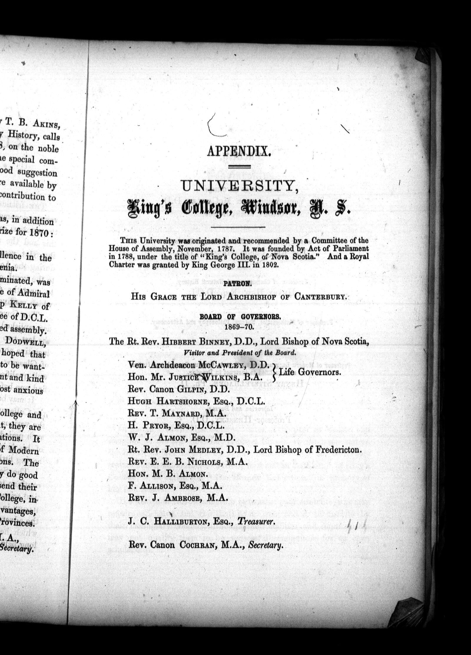 - The calendar of King's College, Windsor, Nova Scotia, A.D. 1869 : 1869