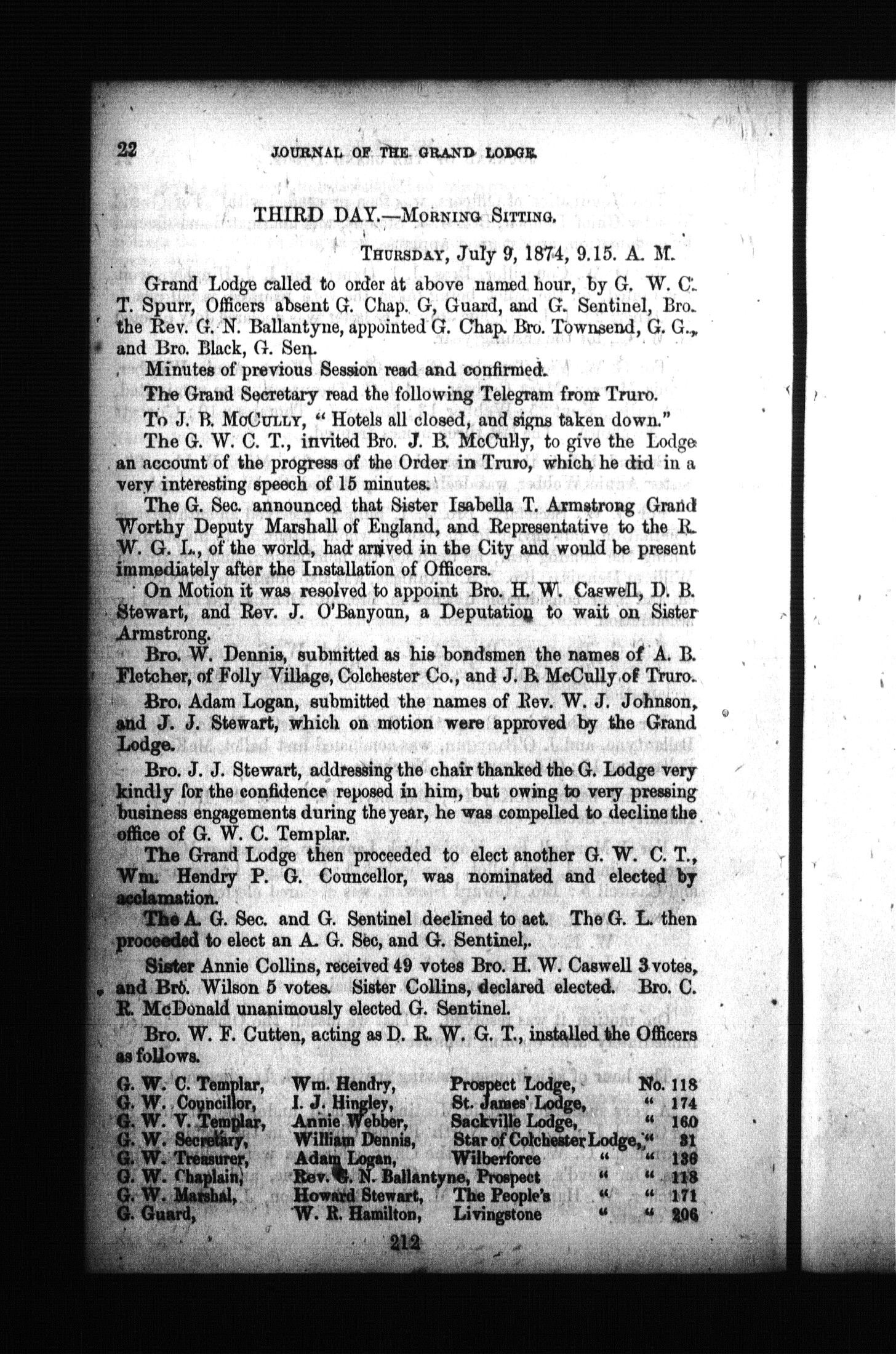 - Journal of proceedings of the eighth annual session of the Grand Lodge of Nova Scotia : held in the city of Halifax, Tuesday, Wednesday & Thursday, July 7th, 8th, and 9th, 1874 / I.O.G.T.