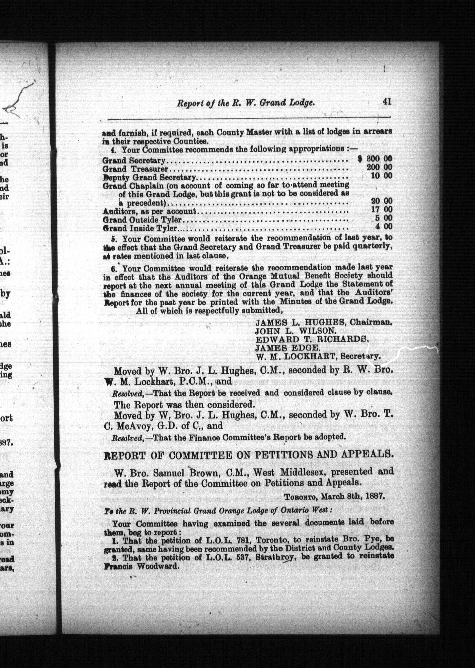 Report of the ... annual meeting of the Right Worshipful the Provincial Grand Orange Lodge of Ontario West : Report of the proceedings of the twenty-eighth annual meeting of the Right Worshipful the Provincial Grand Orange Lodge of Ontario West : held in the County Orange Hall, city o Toronto ... of March, A.D. 1887 : Twenty-Eighth (1887)