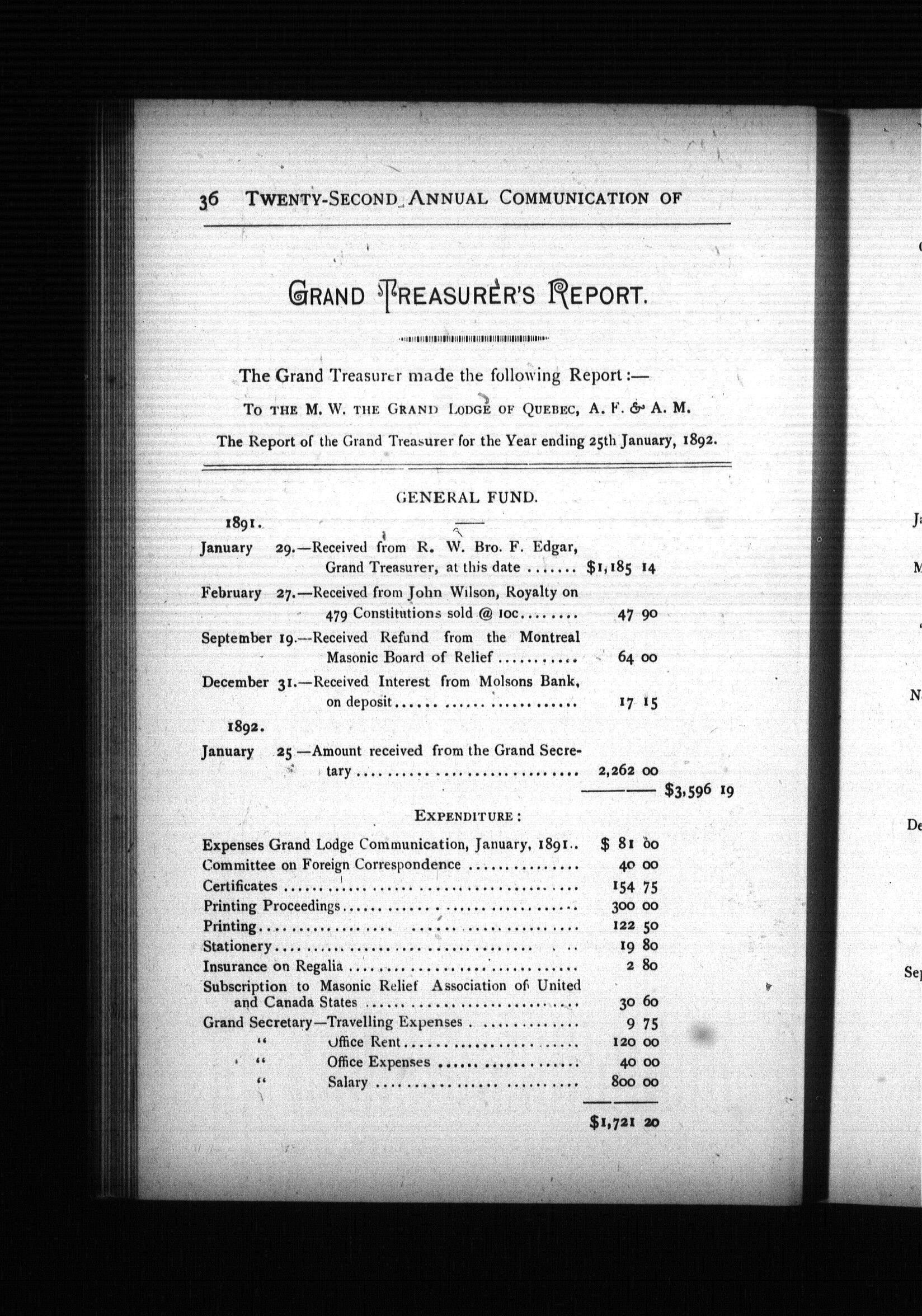 Proceedings of the Grand Lodge of Quebec, Ancient Free and Accepted Masons, at its twenty-second annual communication : Twenty-Second (1892)