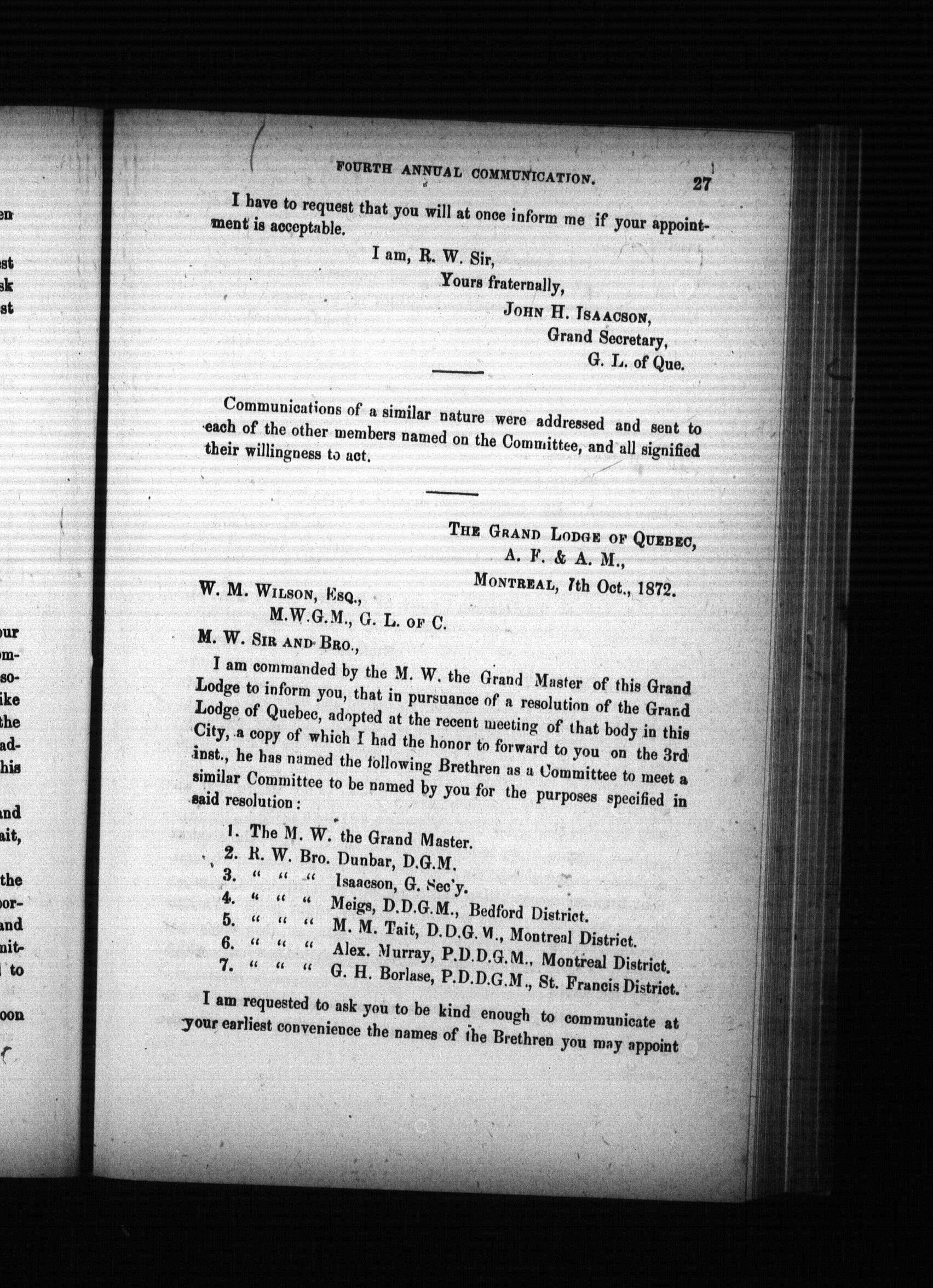 - Proceedings of the Grand Lodge of Quebec, Ancient Free and Accepted Masons, at its fourth annual communication : Fourth (1873)