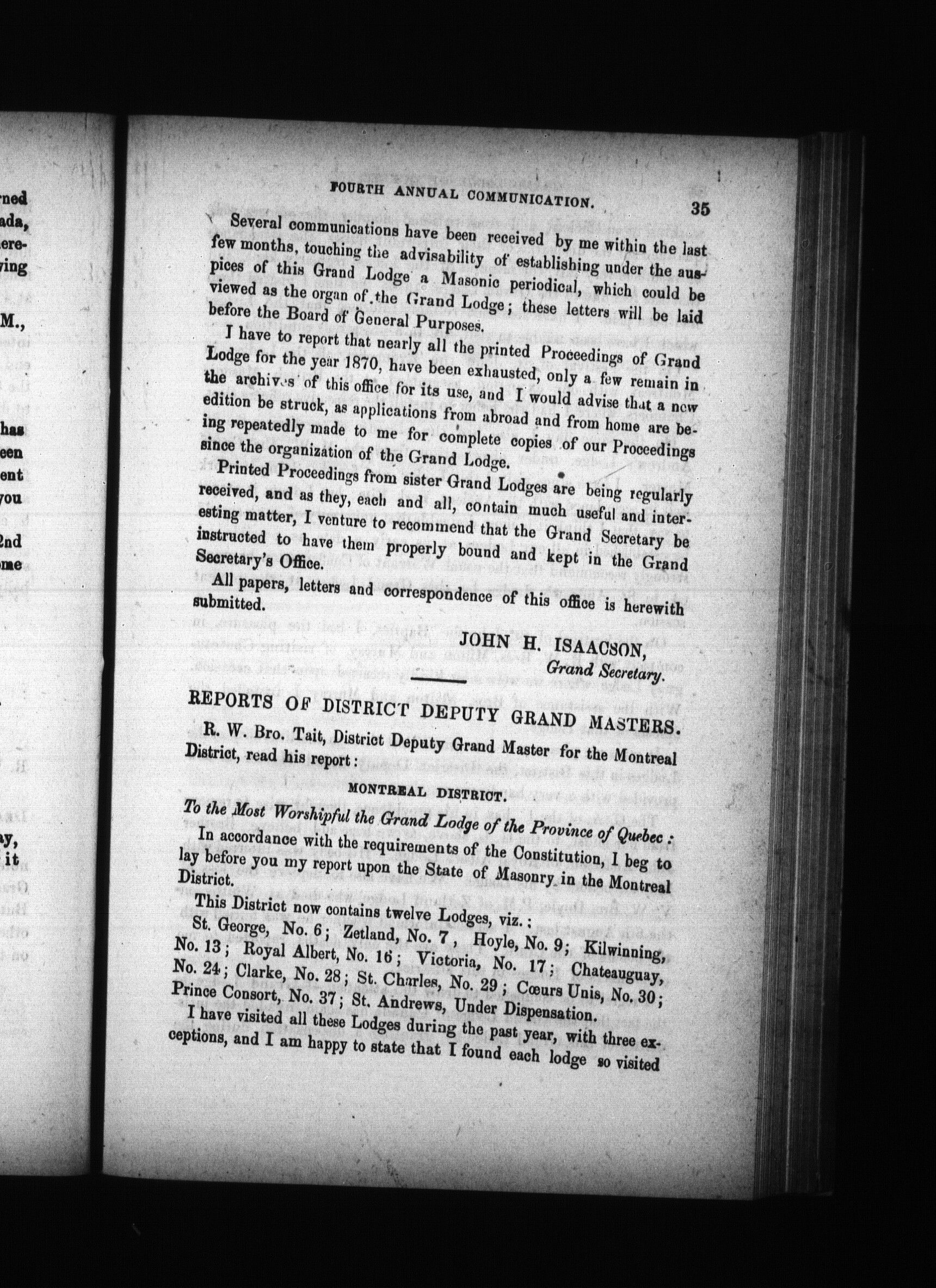 - Proceedings of the Grand Lodge of Quebec, Ancient Free and Accepted Masons, at its fourth annual communication : Fourth (1873)