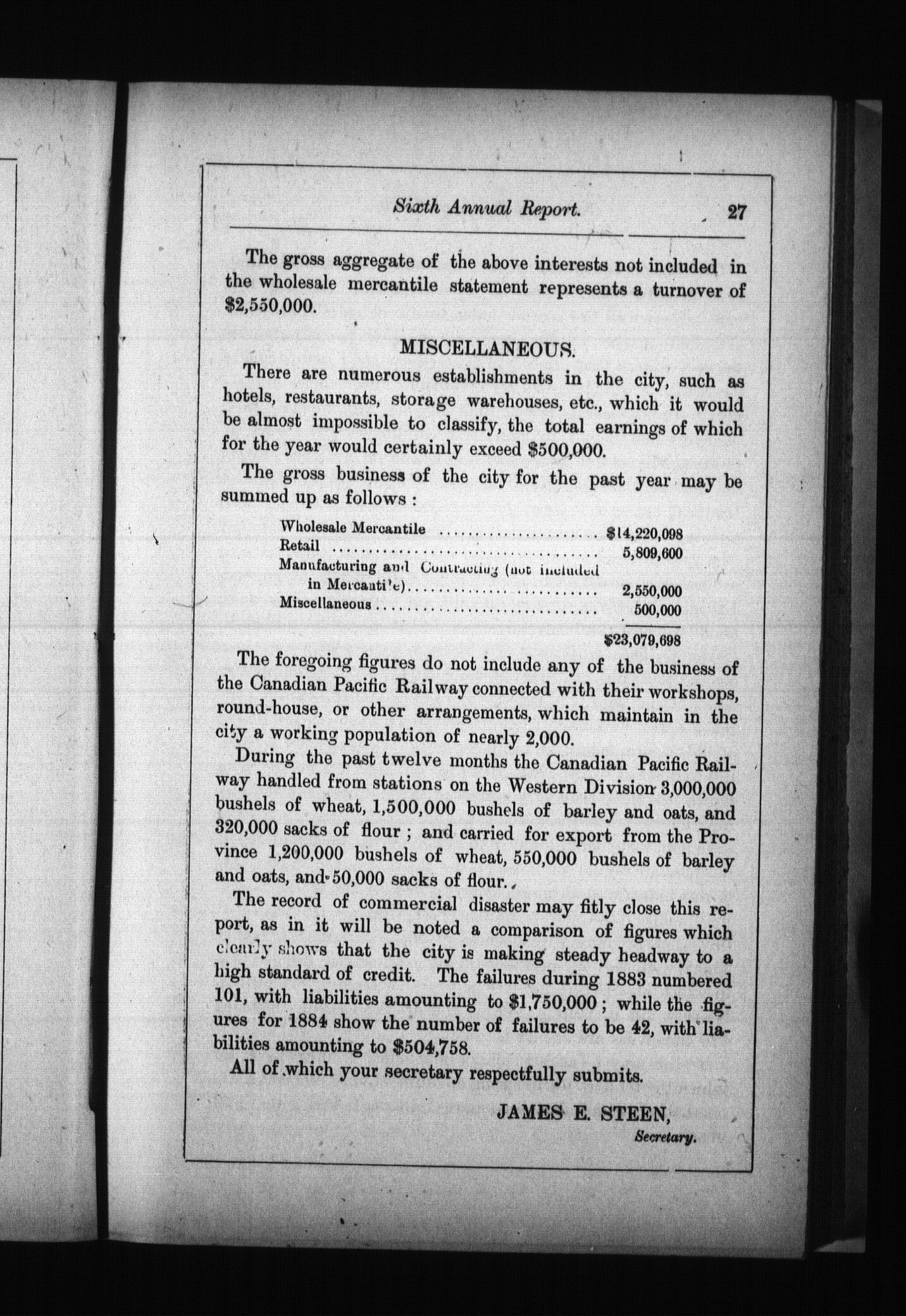 Sixth annual report of the Winnipeg Board of Trade : together with a statistical report of the city's trade for 1884 : Sixth (1884)