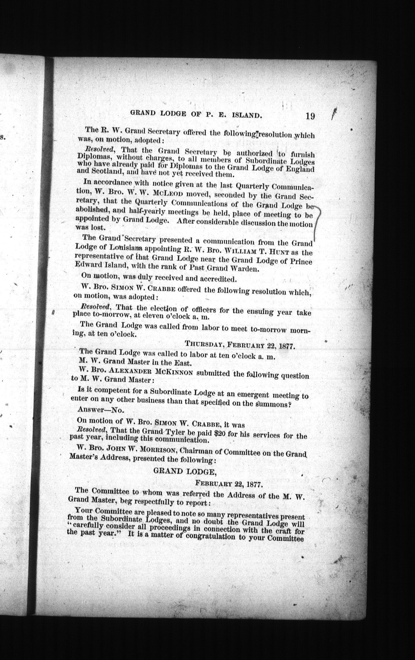 Proceedings of the M.W. Grand Lodge of the Ancient & Honorable Fraternity of Free and Accepted Masons of Prince Edward Island ... and ... annual communication : Proceedings of the M.W. Grand Lodge of the Ancient & Honorable Fraternity of Free and Accepted Masons of Prince Edward Island ... second annual communication held in Charlottetown, February 21 & 22, 1877 : Second (1877)