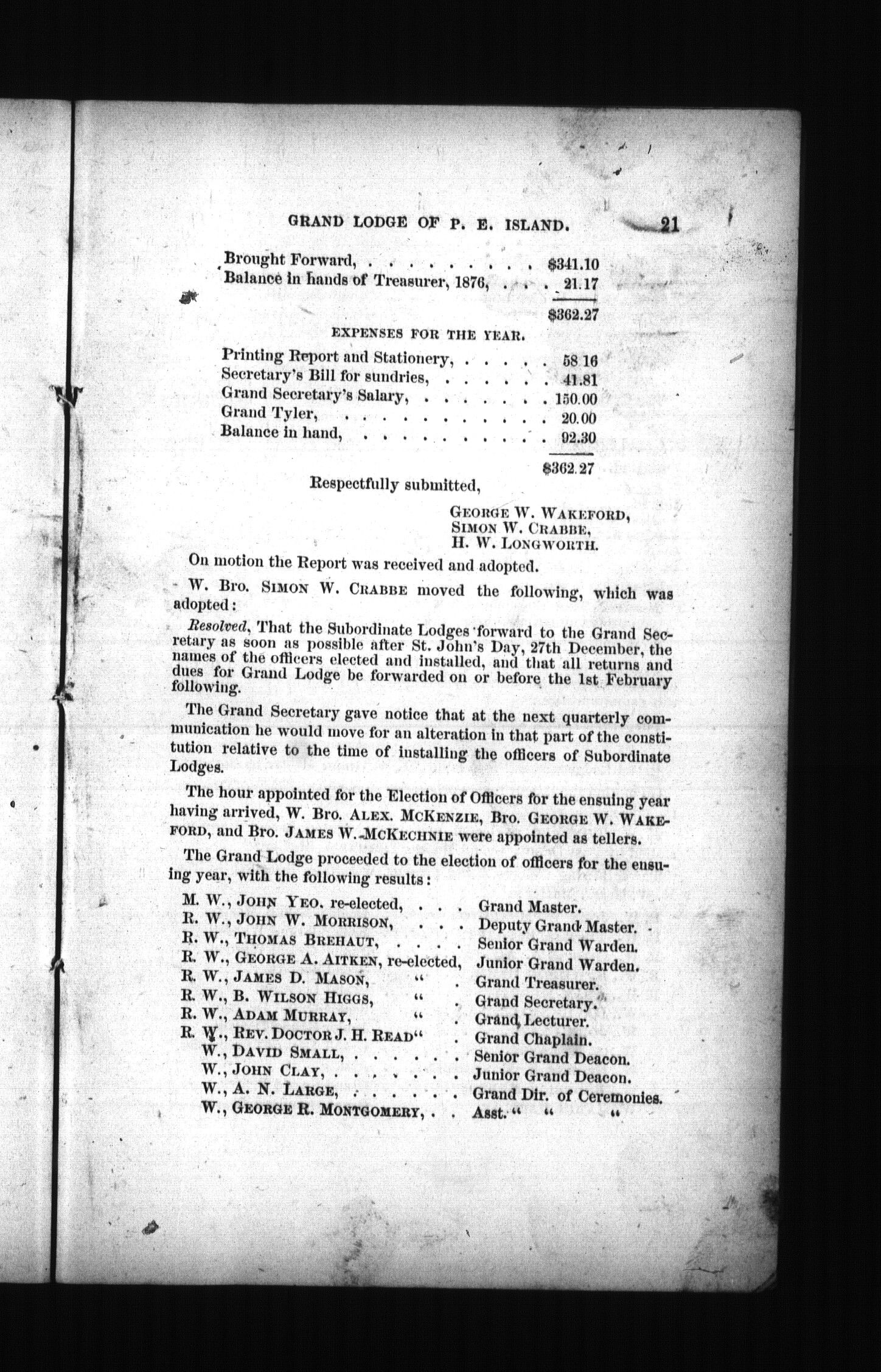 Proceedings of the M.W. Grand Lodge of the Ancient & Honorable Fraternity of Free and Accepted Masons of Prince Edward Island ... and ... annual communication : Proceedings of the M.W. Grand Lodge of the Ancient & Honorable Fraternity of Free and Accepted Masons of Prince Edward Island ... second annual communication held in Charlottetown, February 21 & 22, 1877 : Second (1877)