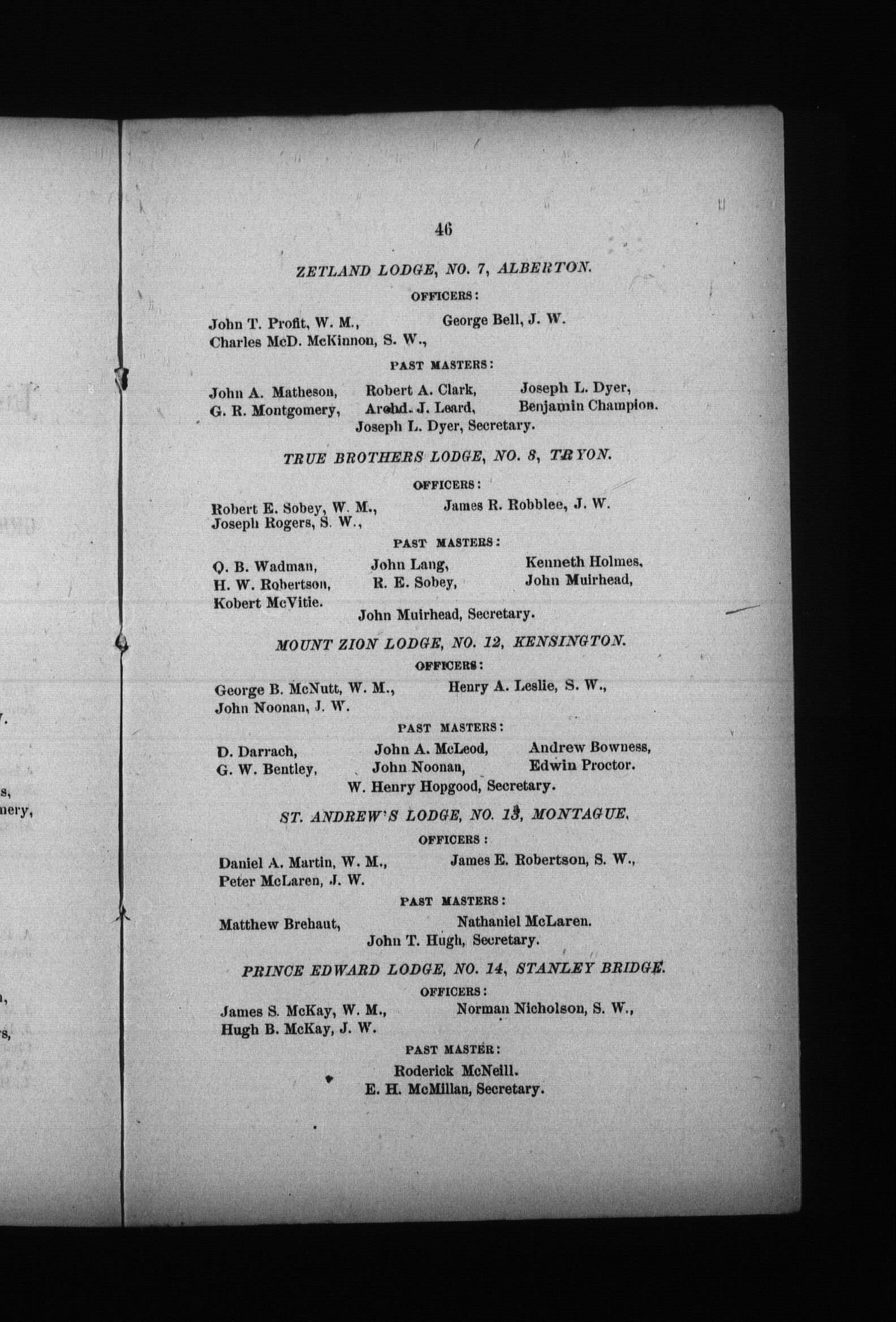 Aide [Charlottetown, P.E.I.] : [M.W. Grand Lodge of the Ancient and Honorable Fraternity of Free and Accepted Masons of Prince Edward Island], 1887; 50 images, 49 avec recherche en texte intégral