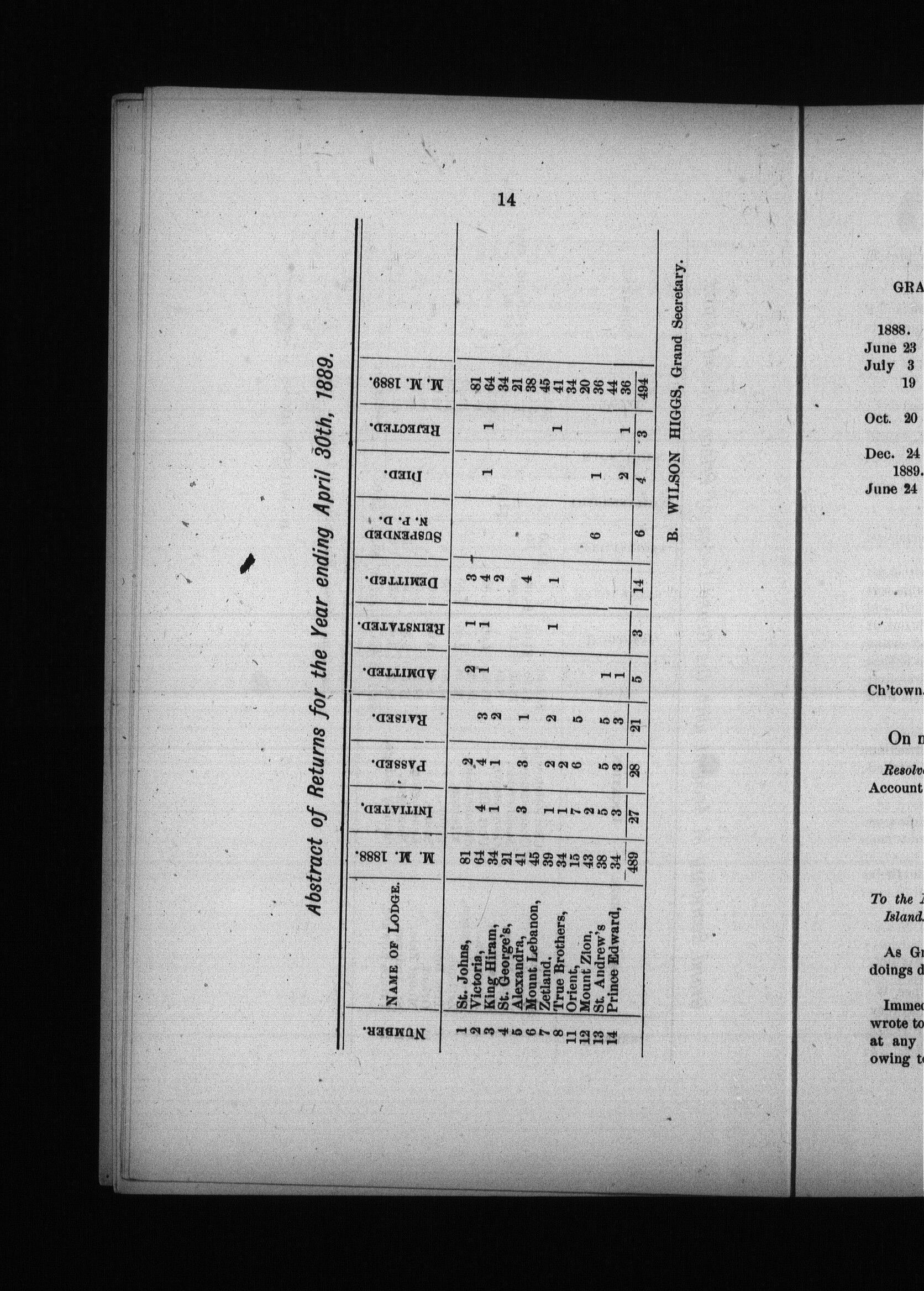 Proceedings of the M.W. Grand Lodge of the Ancient & Honorable Fraternity of Free and Accepted Masons of Prince Edward Island ... and ... annual communication : Proceedings of the M.W. Grand Lodge of the Ancient and Honorable Fraternity of Free and Accepted Masons of Prince Edward Island : fourteenth annual communication held at Charlottetown, 24th June, 1889 : Fourteenth (1889)