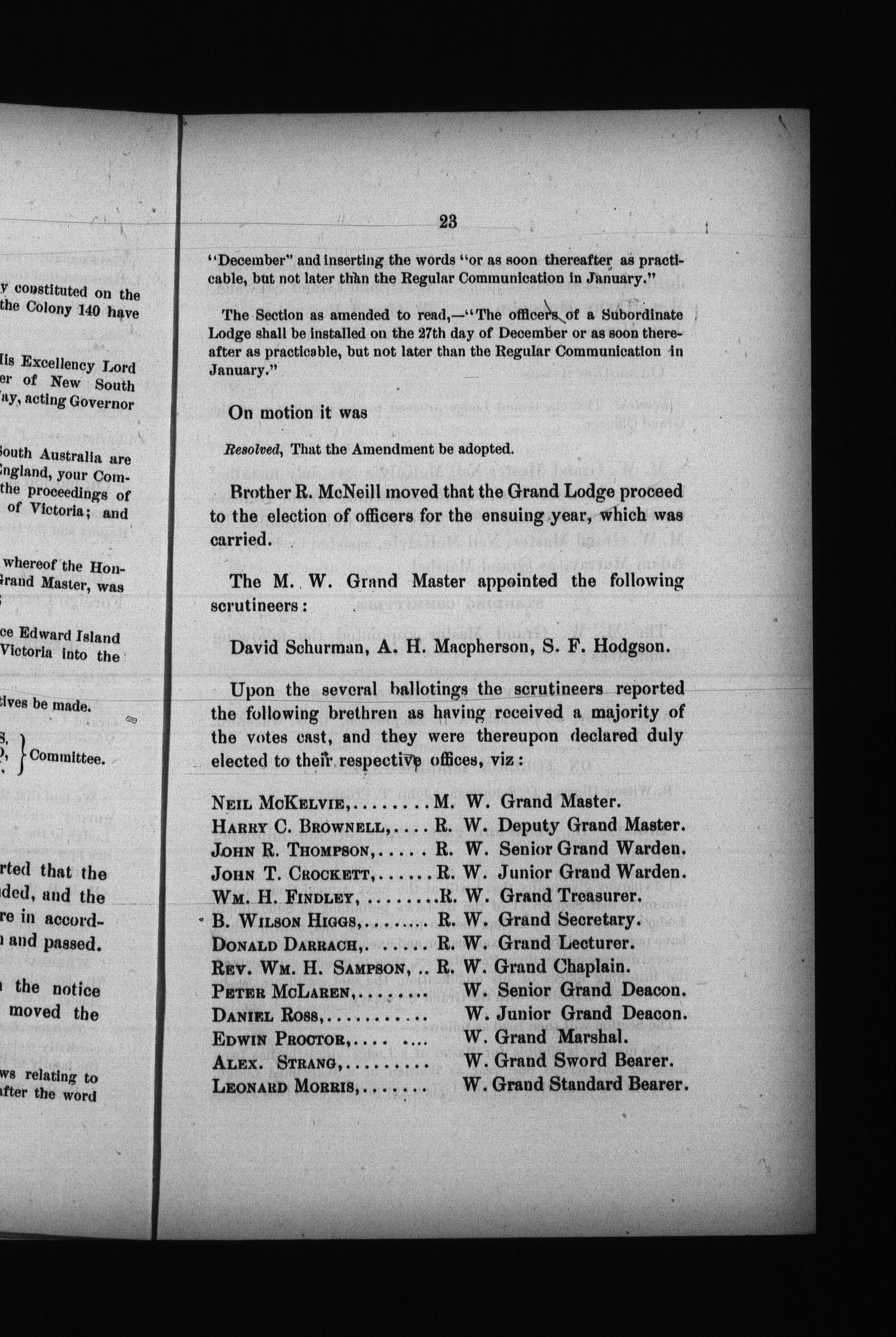 [Charlottetown, P.E.I.] : [M.W. Grand Lodge of the Ancient and Honorable Fraternity of Free and Accepted Masons of Prince Edward Island], 1889; 56 images, 55 avec recherche en texte intégral