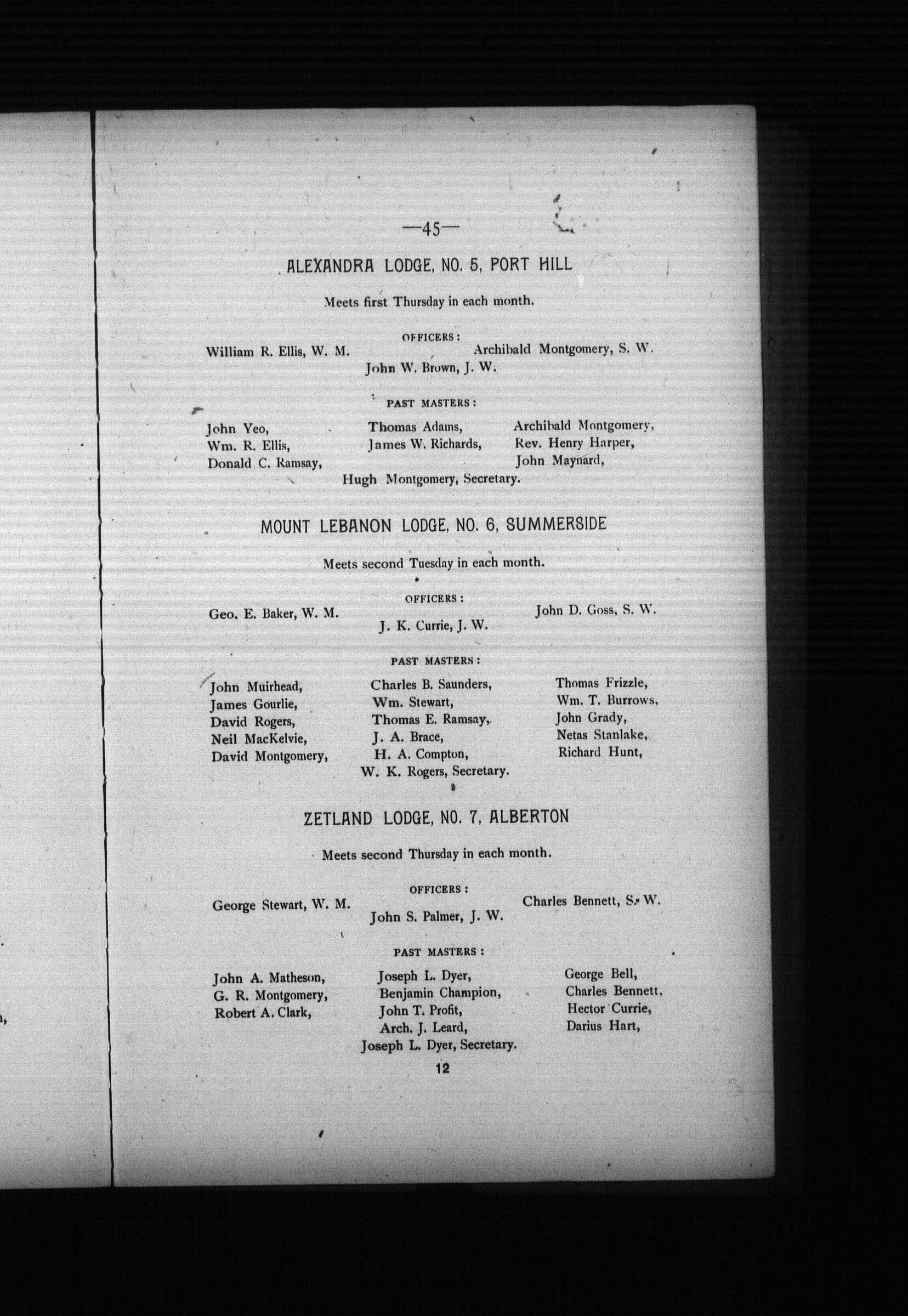 Aide [Charlottetown, P.E.I.] : [M.W. Grand Lodge of the Ancient and Honorable Fraternity of Free and Accepted Masons of Prince Edward Island], 1894; 52 images, 50 avec recherche en texte intégral