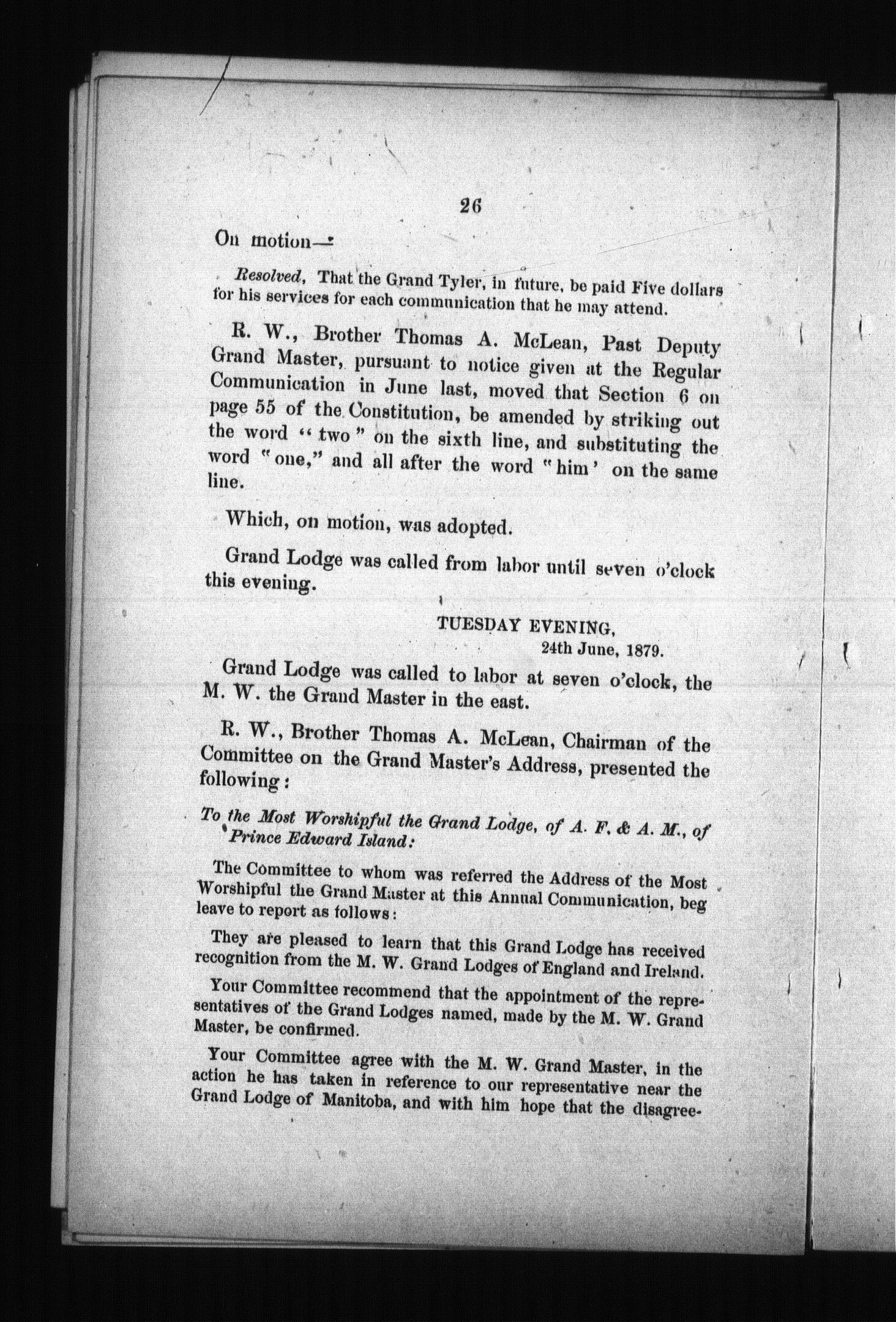 Proceedings of the M.W. Grand Lodge of the Ancient & Honorable Fraternity of Free and Accepted Masons of Prince Edward Island ... and ... annual communication : Proceedings of the M.W. Grand Lodge of the Ancient and Honorable Fraternity of Free and Accepted Masons of Prince Edward Island ... annual communication held at Charlottetown, 24th 7 25th June, 1879 : Fourth (1879)