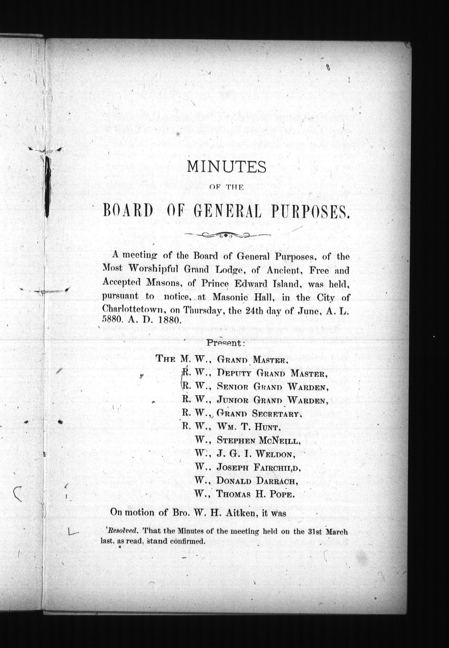 - [Charlottetown, P.E.I.] : [M.W. Grand Lodge of the Ancient and Honorable Fraternity of Free and Accepted Masons of Prince Edward Island], 1880