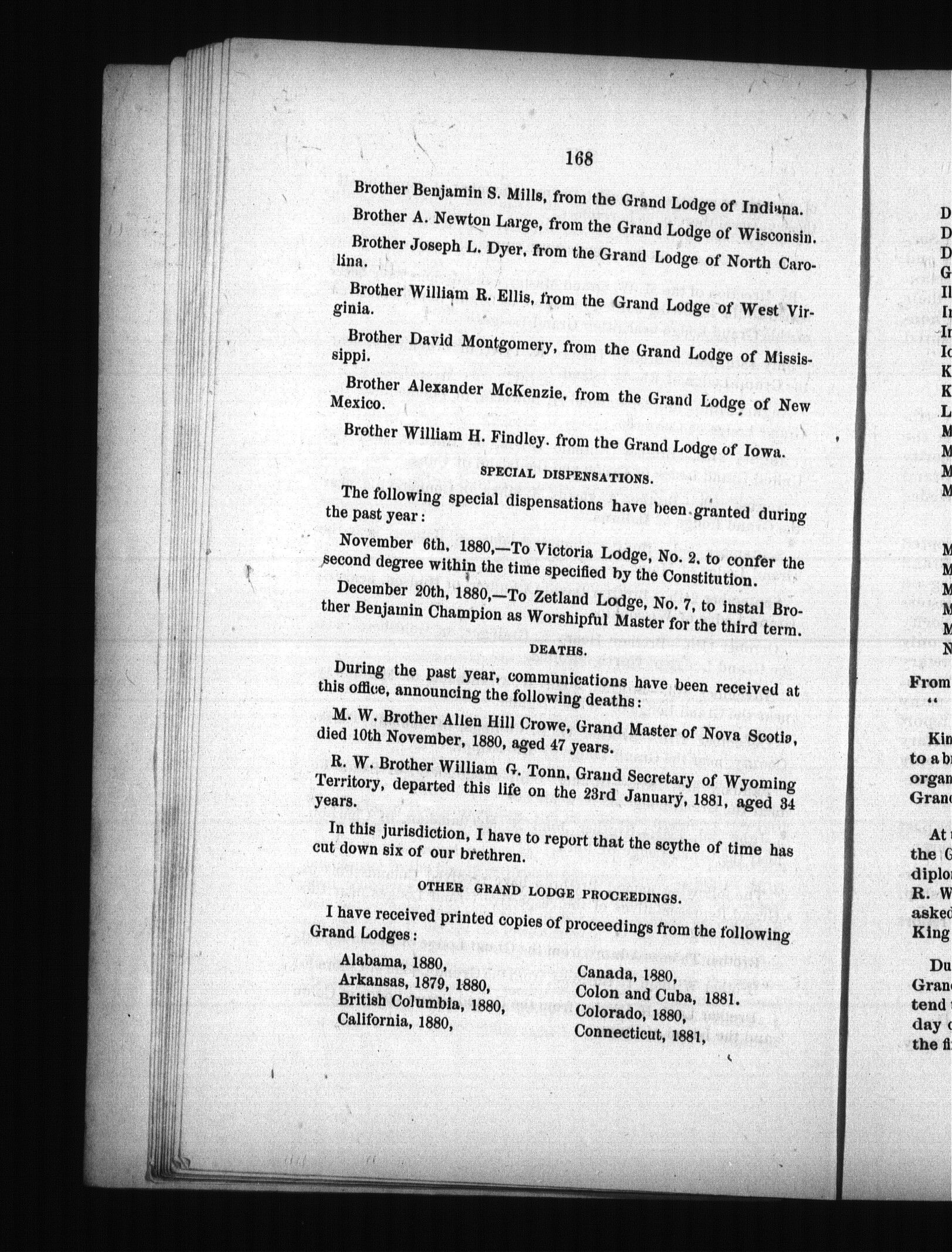 [Charlottetown, P.E.I.] : [M.W. Grand Lodge of the Ancient and Honorable Fraternity of Free and Accepted Masons of Prince Edward Island], 1881; 90 images, 89 avec recherche en texte intégral