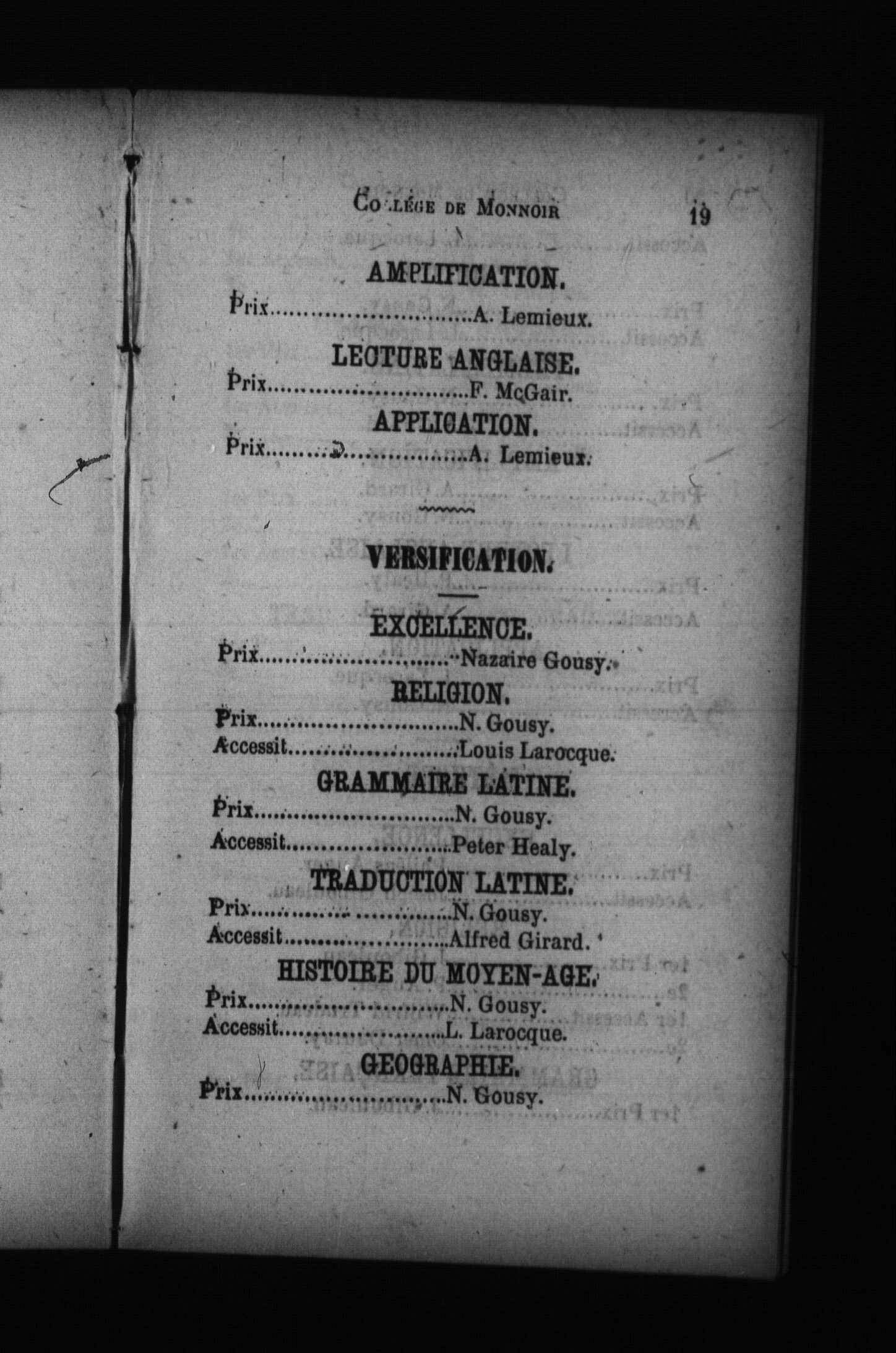 Palmare du Collège Monnoir : Palmare du Collège Monnoir : 1875