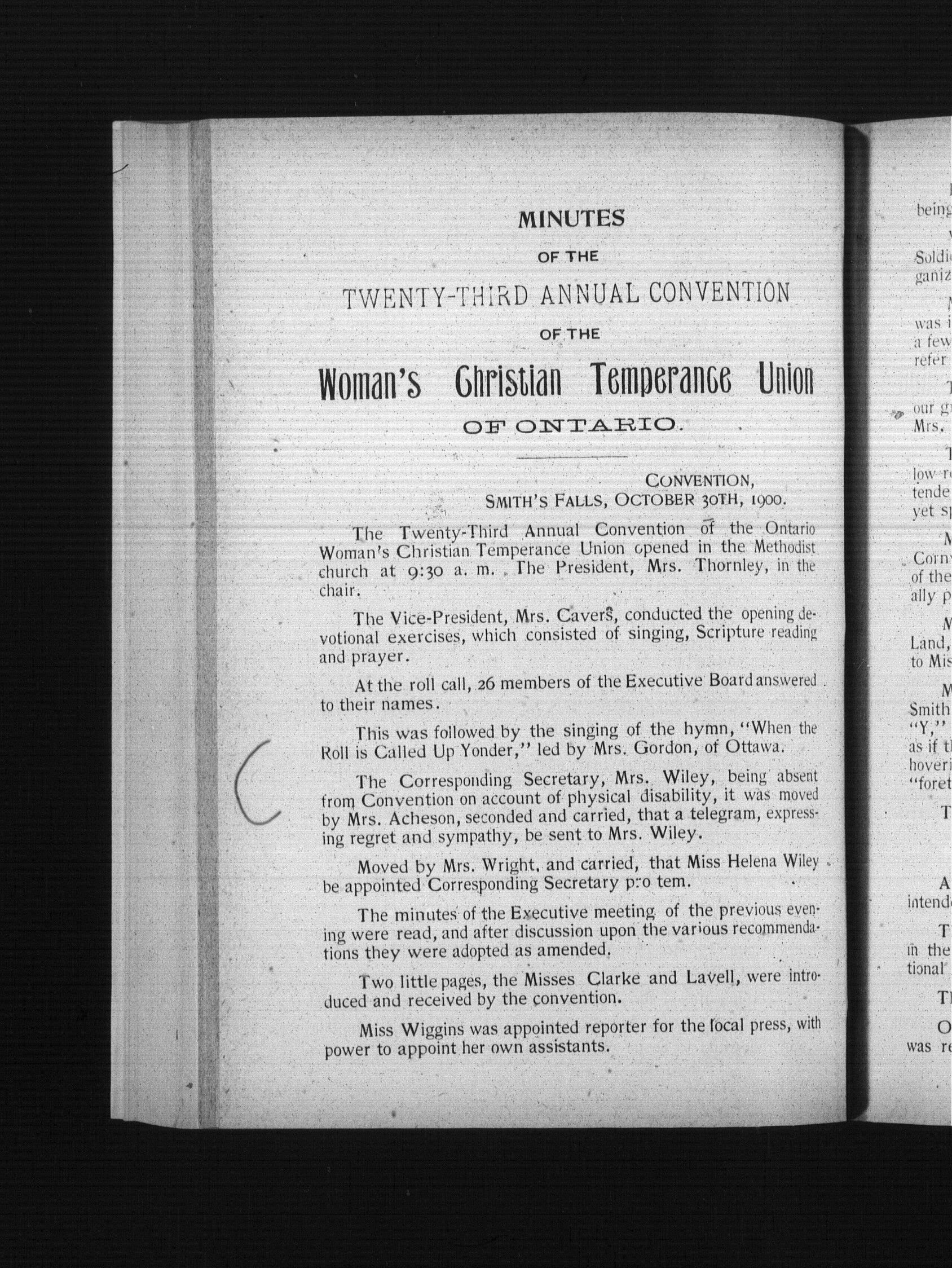 Report of the ... annual meeting of the Ontario Woman's Christian Temperance Union : Report of the twenty-third annual meeting of the Ontario Woman's Christian Temperance Union : held in Smith's Falls Oct. 29 to Nov. 2, 1900 : Twenty-Third (1900)