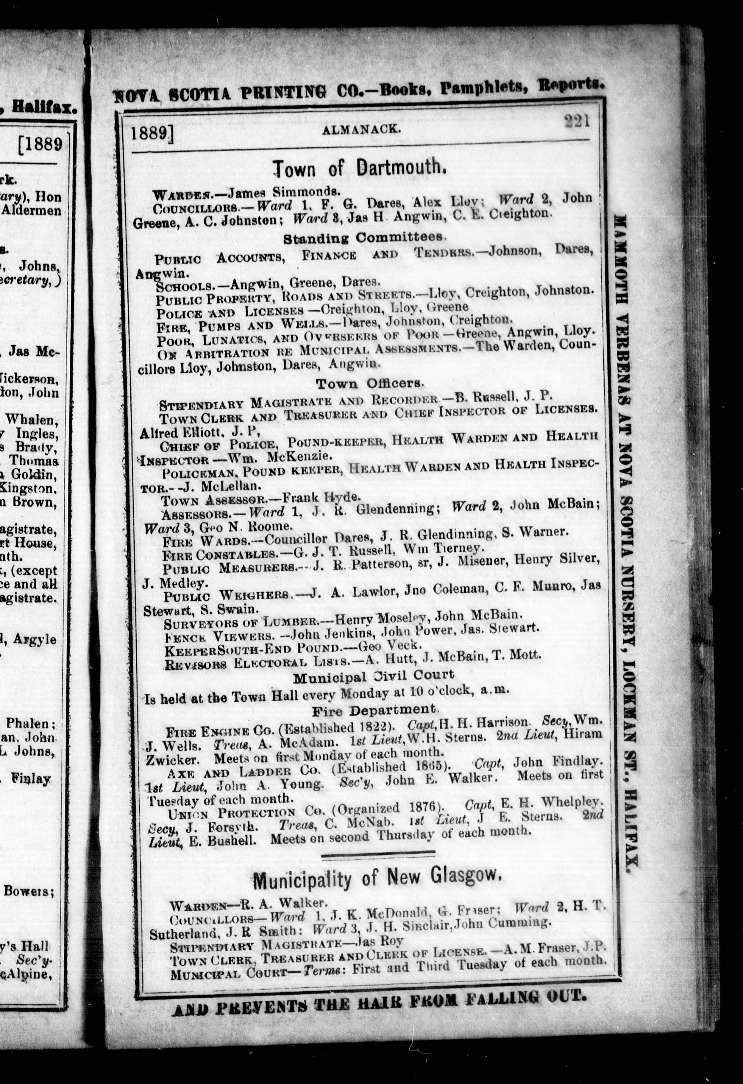 Halifax, N.S.: Published by the Proprietors, McAlpine & Barnes, [1889?]; 281 images, 278 avec recherche en texte intégral