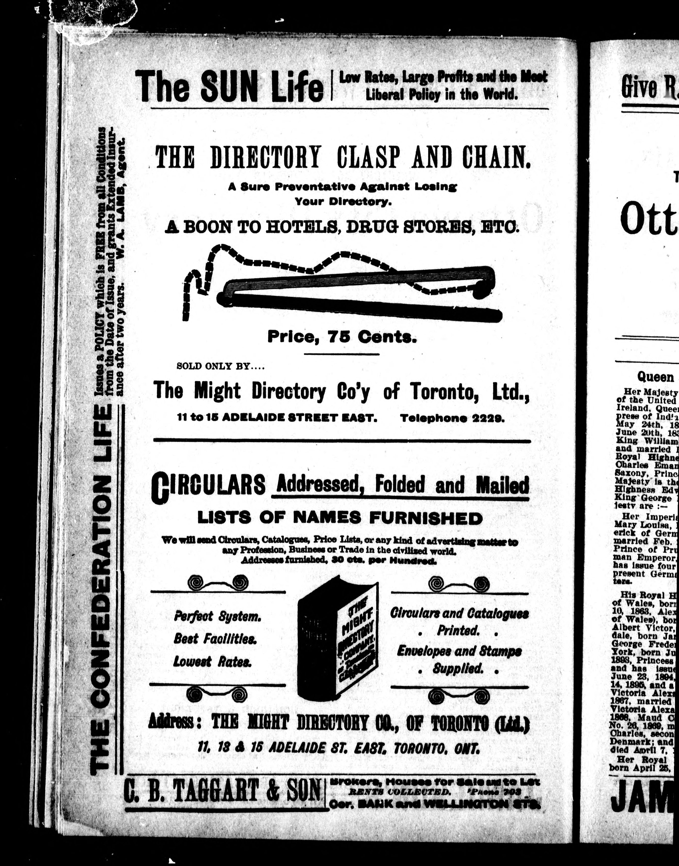 Ottawa: Published by the Might Directory Company of Toronto (Ltd.), [1897?]; 584 images, 574 avec recherche en texte intégral