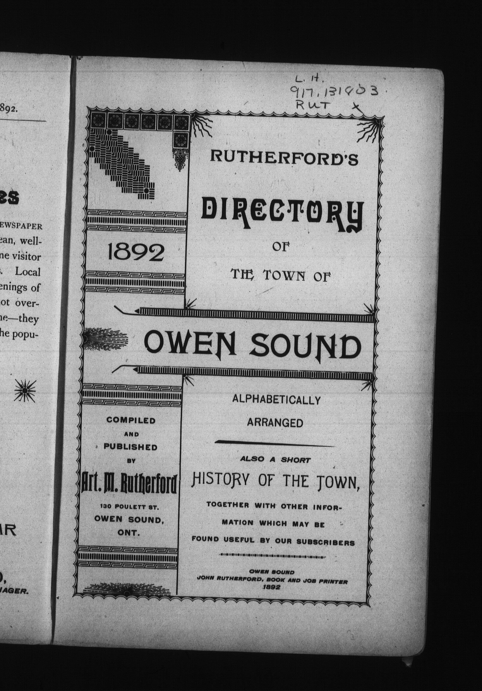 Rutherford's directory of the town of Owen Sound / : Rutherford's directory of the town of Owen Sound : 1892