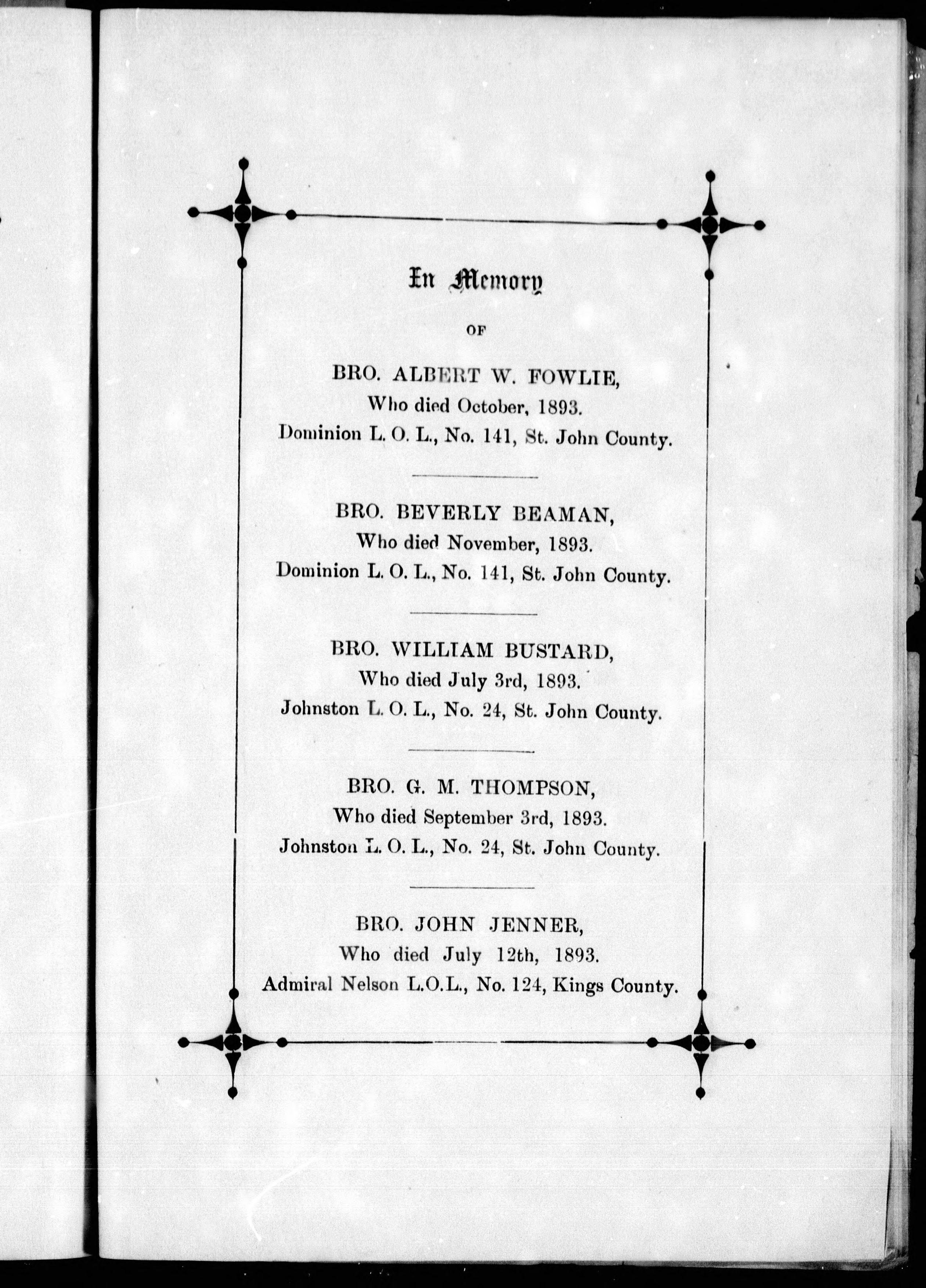- [Saint John, N.B.?]: [Right Worshipful the Grand Lodge of New Brunswick, Loyal Orange Association of British America], 1894