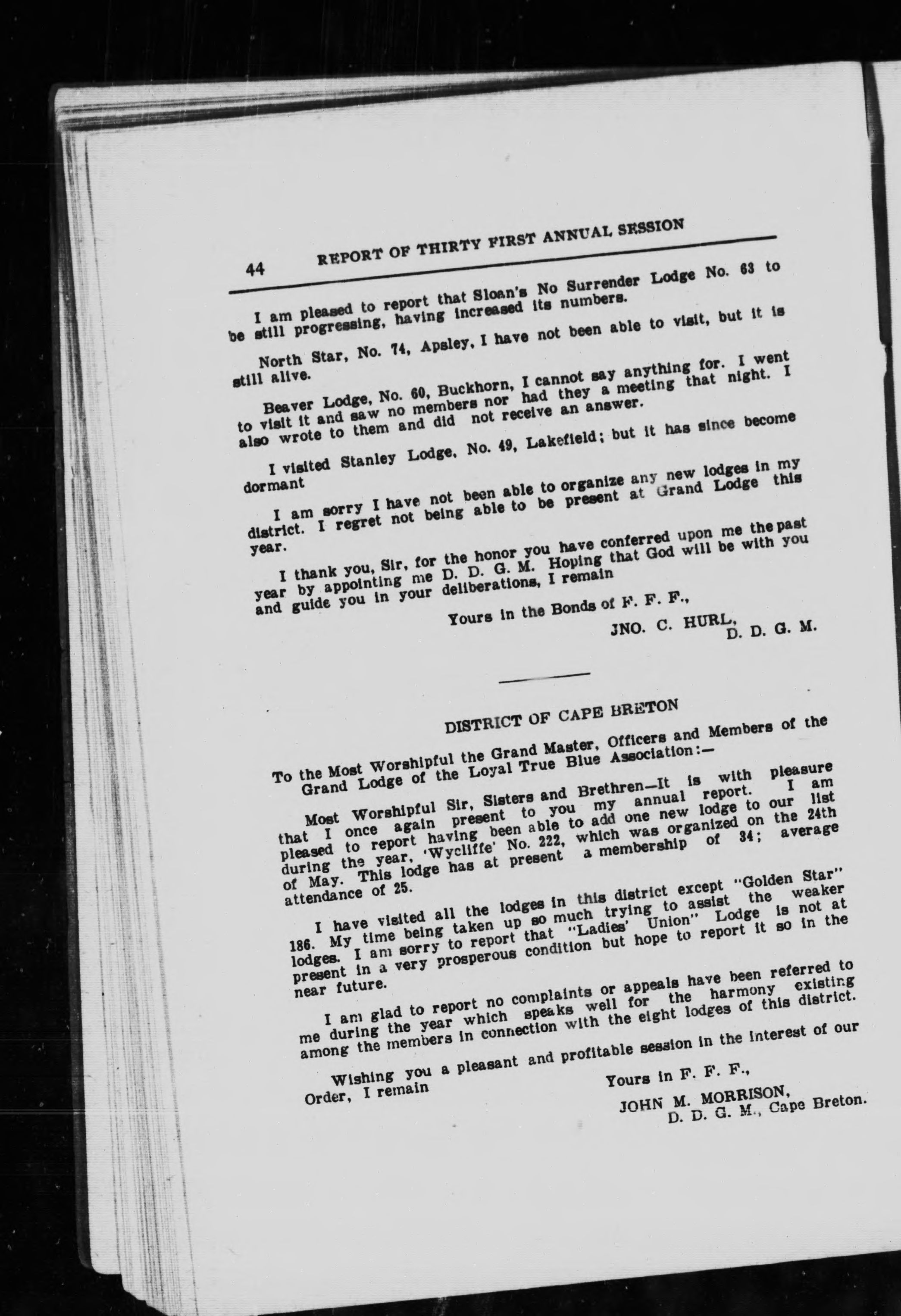 [Ontario?]: [Grand Lodge of the Loyal True Blue Association], 1905; 85 images, 82 with full-text search