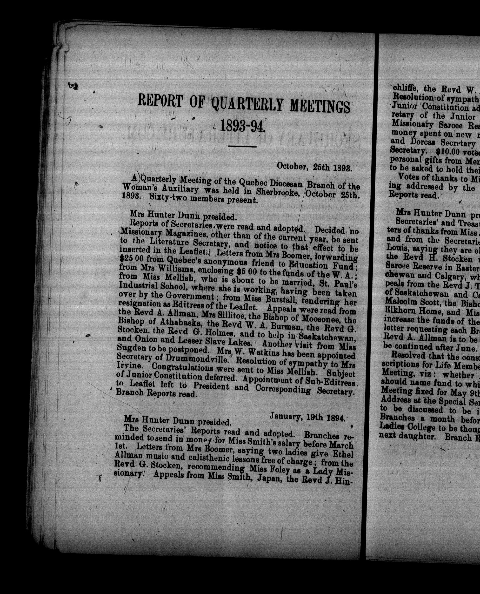 - [Québec] : [Quebec Diocesan Branch of the Woman's Auxiliary to the Board of the Domestic & Foreign Missionary Society of the Church of England in Canada], 1894